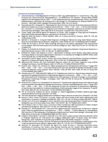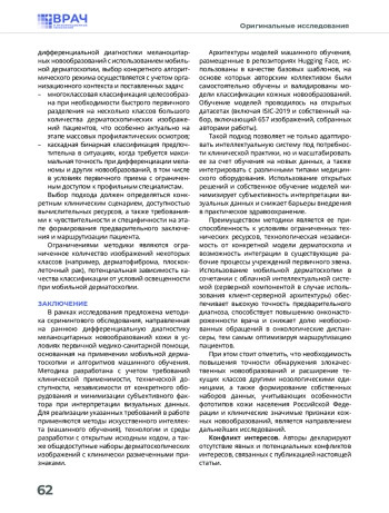 Заключение. Полученные количественные значения точности обнаружения злокачественных кожных новообразований разработанной методикой скринингового обследования позволяют рекомендовать внедрение многоклассовой классификации для первичного разделения большого объема дерматоскопических изображений пациентов по нозологическому признаку между профильными специалистами в процессе проведения массовый (выездных) профилактических осмотров, а внедрение каскадной бинарной классификации в условиях первичного приема с ограниченным доступом к профильным специалистам для дифференциации меланомы от других кожных новообразований. Разработанная методика скринингового обследования пациентов может быть внедрена в медицинскую практику в качестве системы поддержки принятия решений врача.