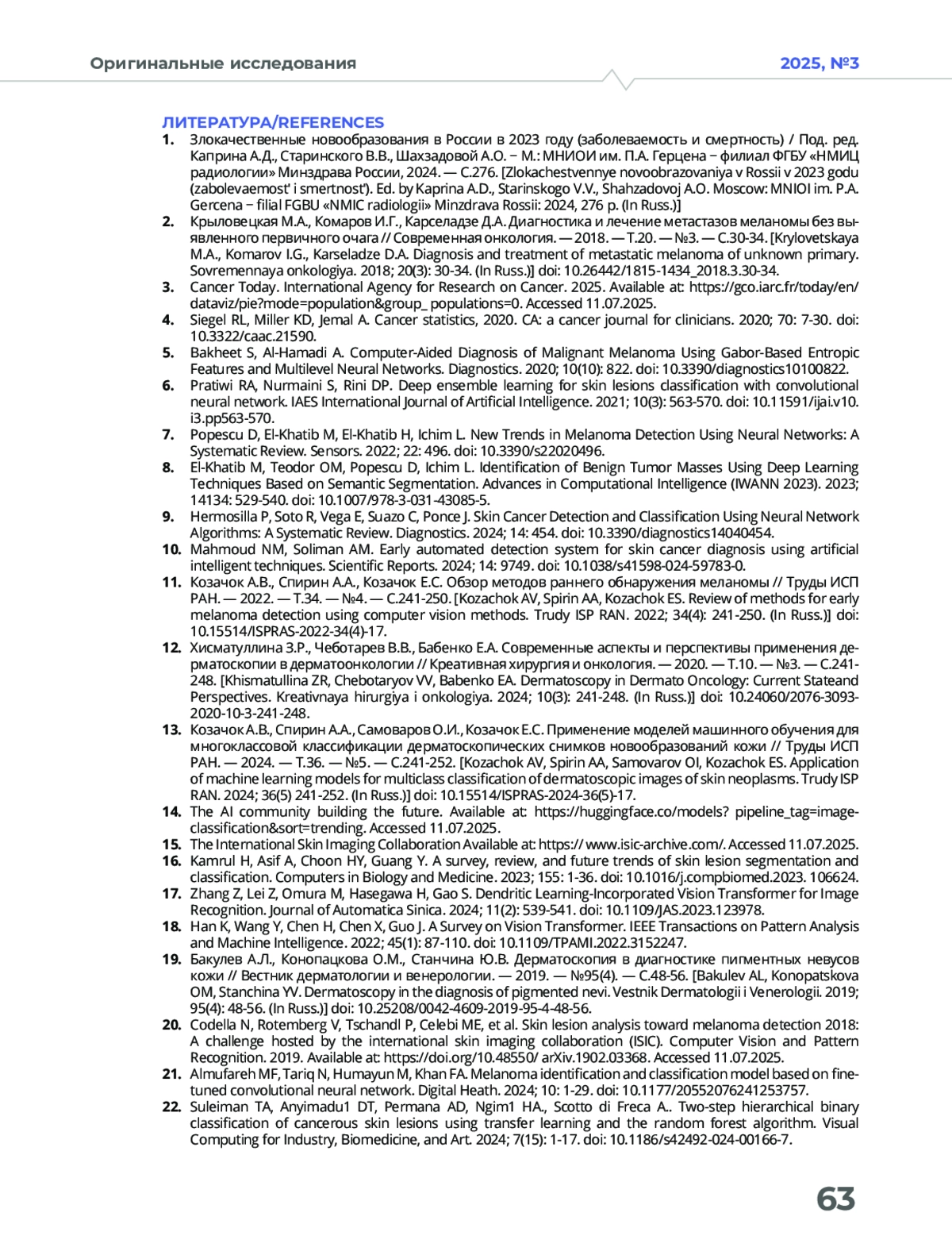 Статья: МЕТОДИКА СКРИНИНГОВОГО ОБСЛЕДОВАНИЯ ДЛЯ РАННЕЙ ДИФФЕРЕНЦИАЛЬНОЙ ДИАГНОСТИКИ НОВООБРАЗОВАНИЙ КОЖИ С ИСПОЛЬЗОВАНИЕМ МОБИЛЬНОЙ ДЕРМАТОСКОПИИ (2025)