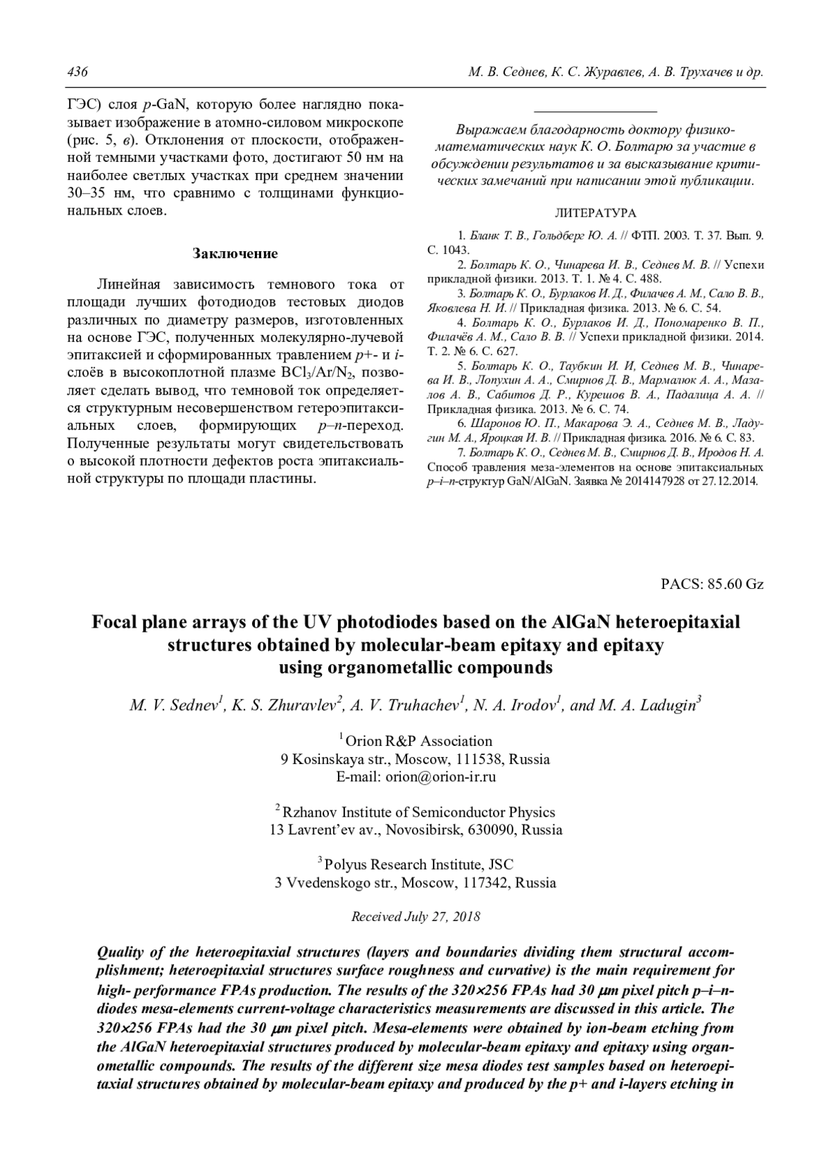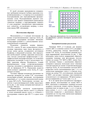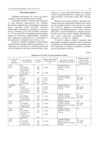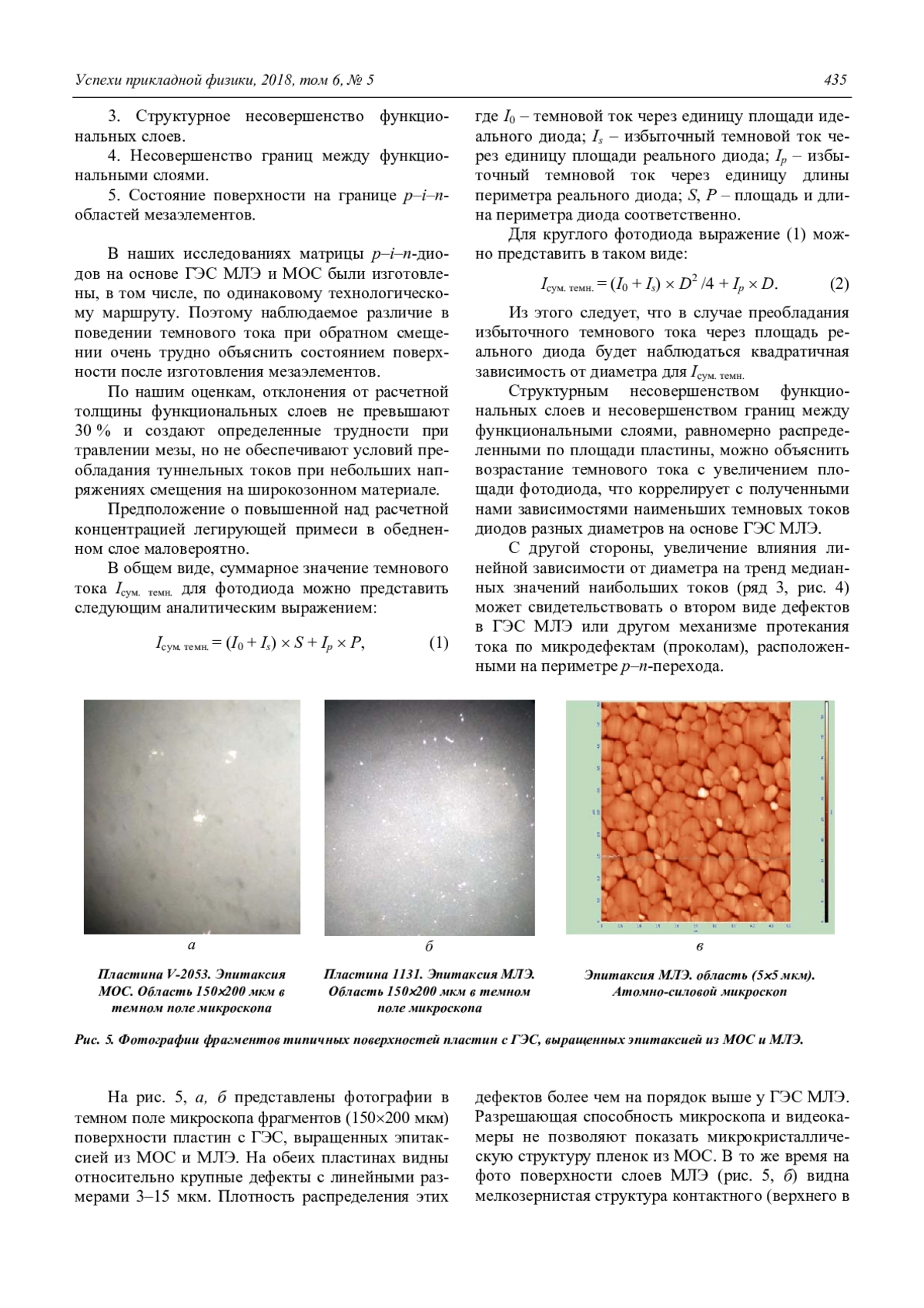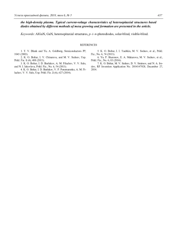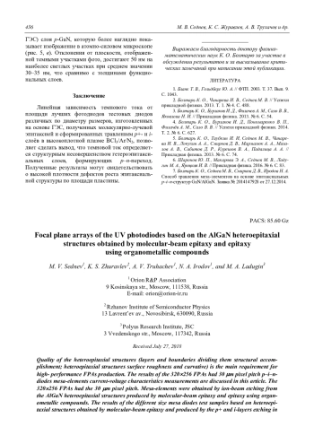 В работе представлены результаты измерения вольтамперных характеристик (ВАХ) мезаэлементов матриц формата 320256 с шагом 30 мкм p–i–n-диодов. Данные образцы сформированы ионно-лучевым травлением на основе гетероэпитаксиальных структур (ГЭС) AlxGa1-xN, изготовленных методами молекулярно-лучевой эпитаксии (МЛЭ) и эпитаксии с использованием металлоорганических соединений (МОС). Использованы также тестовые образцы мезадиодов различных по диаметру размеров, изготовленных на основе ГЭС, полученных молекулярно-лучевой эпитаксией и сформированных травлением p+- и iслоёв в высокоплотной плазме BCl3/Ar/N2. Представлены типичные ВАХ p–i–n-диодов на основе ГЭС, полученных разными методами выращивания и формирования мезы. Полученные результаты могут свидетельствовать о высокой плотности дефектов роста эпитаксиальной структуры по площади пластин, изготовленных методом МЛЭ.