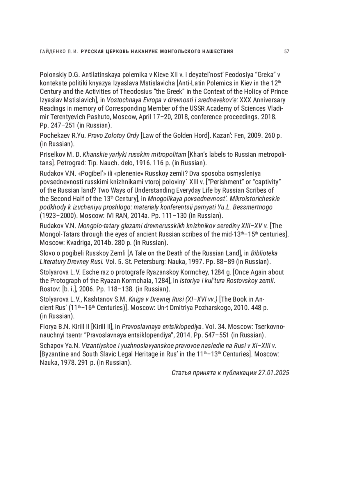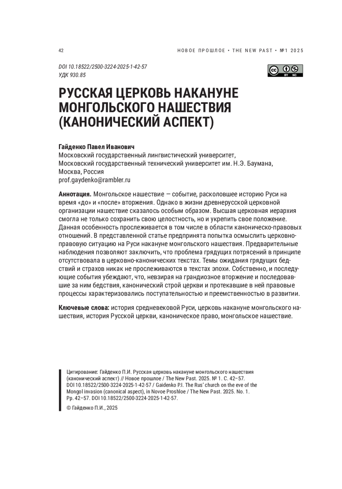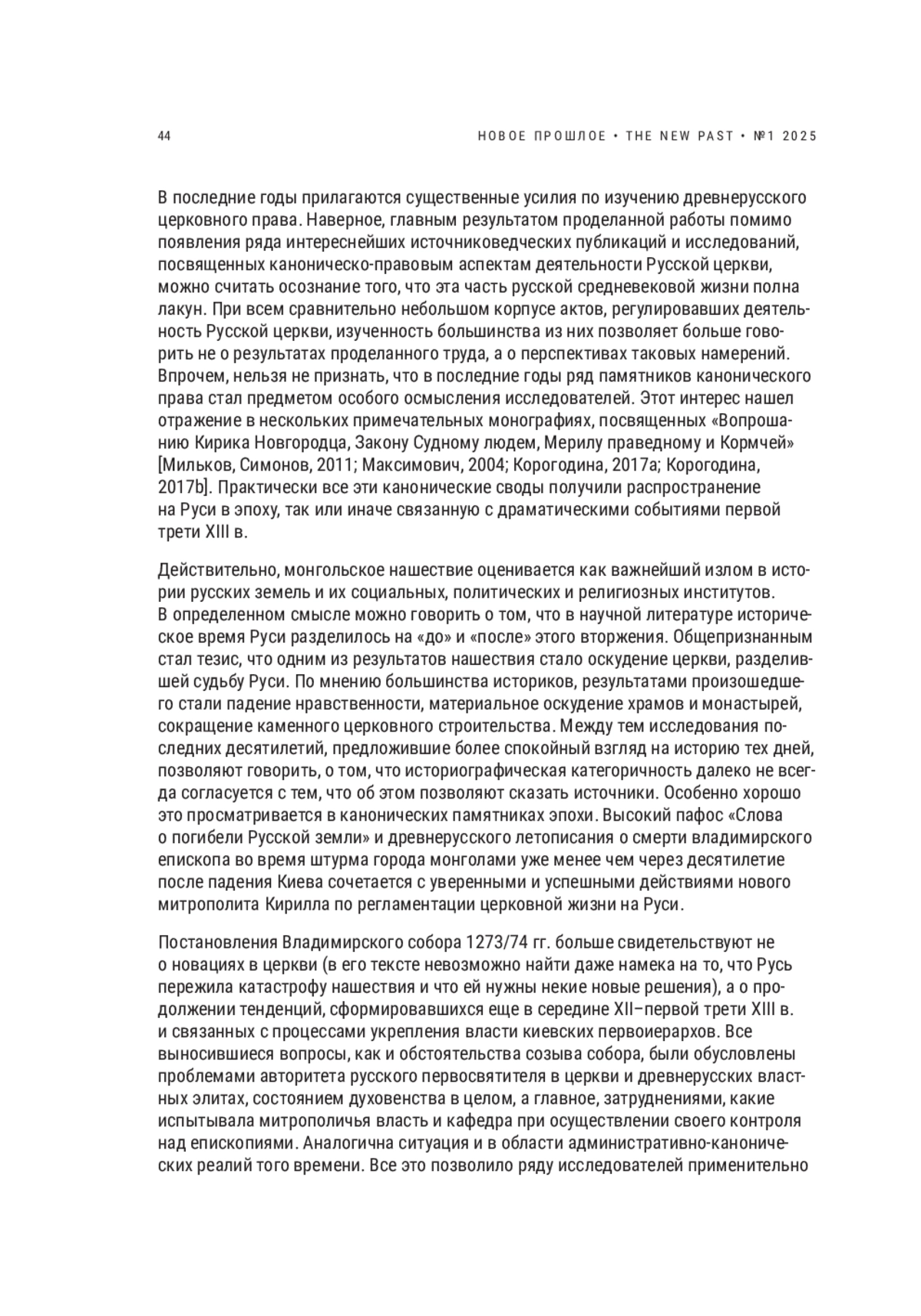 ГАЙДЕНКО П. И. РУССКАЯ ЦЕРКОВЬ НАКАНУНЕ МОНГОЛЬСКОГО НАШЕСТВИЯ (КАНОНИЧЕСКИЙ АСПЕКТ) // НОВОЕ ПРОШЛОЕ. 2025. № 1