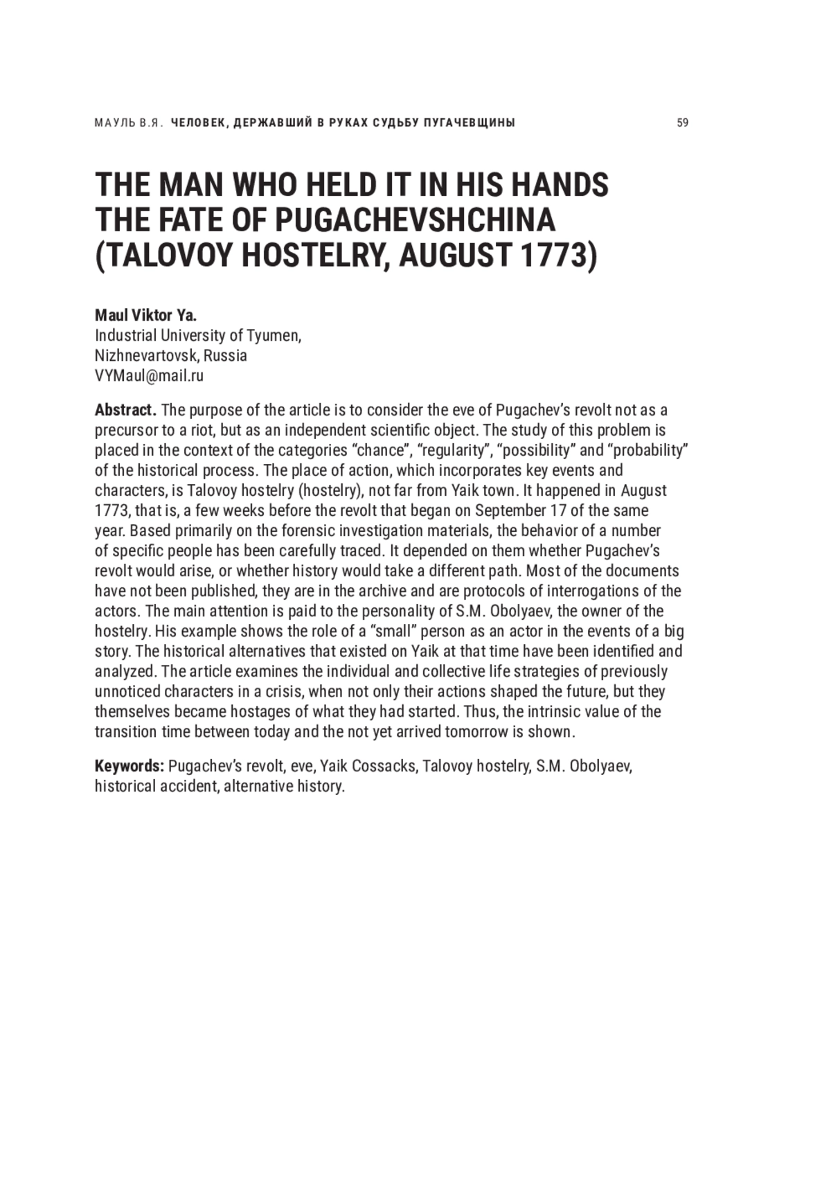 Целью статьи является рассмотрение кануна Пугачевщины не как преддверия бунта, а как самостоятельного научного объекта. Изучение этой проблемы поставлено в контекст категорий «случайность», «закономерность», «возможность», «вероятность» исторического процесса. Местом действия, вобравшем в себя ключевые события и персонажи, выбран Таловой умёт (постоялый двор) недалеко от Яицкого городка. Дело происходило в августе 1773 г., т. е. за несколько недель до бунта, начавшегося 17 сентября того же года. На основе различных источников, прежде всего судебно-следственных материалов, тщательно проанализировано поведение нескольких конкретных людей. От них зависело, вспыхнет ли Пугачевский бунт или история пойдет по другому пути. Большая часть документов не опубликована, находится в архиве и представляет собой протоколы допросов действующих лиц. Главное внимание обращено на личность С. М. Оболяева — хозяина умёта. На его примере показана роль «маленького» человека как актора событий большой истории. Выявлены и проанализированы существовавшие тогда на Яике исторические альтернативы. Исследованы индивидуальные и коллективные жизненные стратегии незаметных ранее персонажей в условиях кризиса, когда не только их действия формировали будущее, но они сами становились заложниками затеянного. Таким образом, показана самоценность переходного времени между сегодня и еще не наступившим завтра