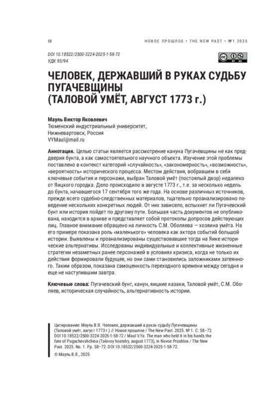 МАУЛЬ В. Я. ЧЕЛОВЕК, ДЕРЖАВШИЙ В РУКАХ СУДЬБУ ПУГАЧЕВЩИНЫ (ТАЛОВОЙ УМЁТ, АВГУСТ 1773 Г.) // НОВОЕ ПРОШЛОЕ. 2025. № 1