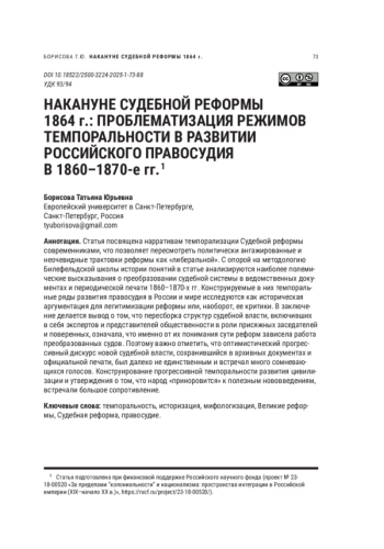 Статья посвящена нарративам темпорализации Судебной реформы современниками, что позволяет пересмотреть политически ангажированные и неочевидные трактовки реформы как «либеральной». С опорой на методологию Билефельдской школы истории понятий в статье анализируются наиболее полемические высказывания о преобразовании судебной системы в ведомственных документах и периодической печати 1860–1870-х гг. Конструируемые в них темпоральные ряды развития правосудия в России и мире исследуются как историческая аргументация для легитимизации реформы или, наоборот, ее критики. В заключение делается вывод о том, что пересборка структур судебной власти, включивших в себя экспертов и представителей общественности в роли присяжных заседателей и поверенных, означала, что именно от их понимания сути реформ зависела работа преобразованных судов. Поэтому важно отметить, что оптимистический прогрессивный дискурс новой судебной власти, сохранившийся в архивных документах и официальной печати, был далеко не единственным и встречал много сомневающихся голосов. Конструирование прогрессивной темпоральности развития цивилизации и утверждения о том, что народ «приноровится» к полезным нововведениям, встречали большое сопротивление