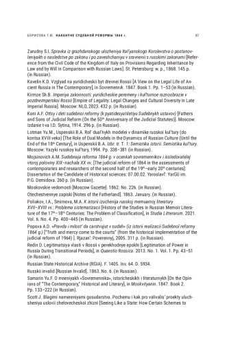 44. Galkin A.G. Sudebnaja reforma 1864 goda v Rossii v kontekste obshhestvenno-politicheskoj zhizni poreformennoj Rossii (1864-1904 gg.) [The judicial reform of 1864 in Russia in the context of the socio-political life of post-reform Russia (1864-1904)]: dissertation of the Doсtor of Historical sciences: 07.00.02. Moscow: MPGU, 2011. 471 p. (in Russian). EDN: QFVXDV
