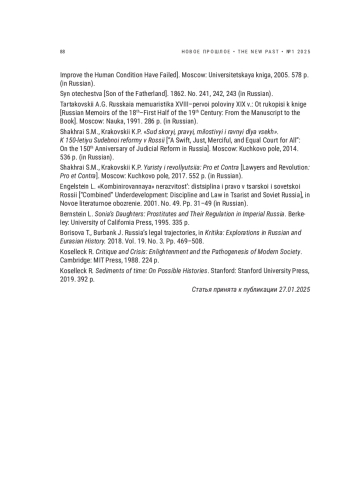 72. Engelstein L. “Kombinirovannaya” nerazvitost’: distsiplina i pravo v tsarskoi i sovetskoi Rossii [“Combined” Underdevelopment: Discipline and Law in Tsarist and Soviet Russia], in Novoe literaturnoe obozrenie. 2001. No. 49. Pp. 31-49 (in Russian).