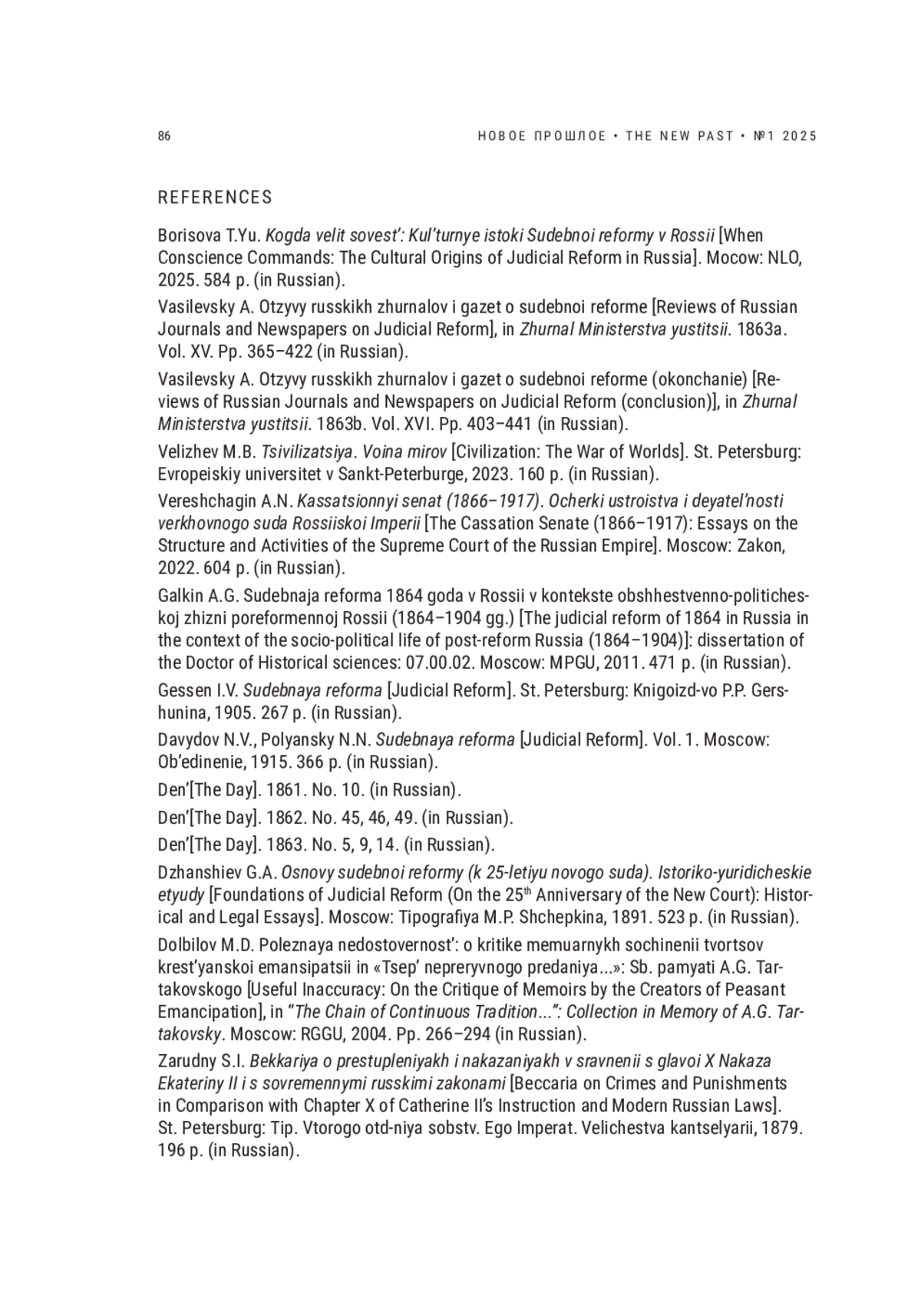 1. Борисова Т.Ю. Когда велит совесть: Культурные истоки Судебной реформы в России. М.: НЛО, 2025. 584 c.