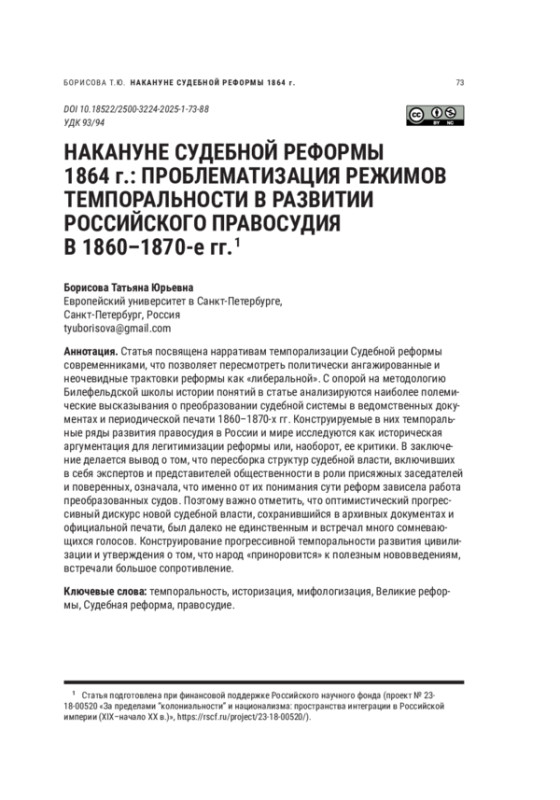 39. Borisova T.Yu. Kogda velit sovest’: Kul’turnye istoki Sudebnoi reformy v Rossii [When Conscience Commands: The Cultural Origins of Judicial Reform in Russia]. Mocow: NLO, 2025. 584 p. (in Russian).