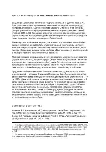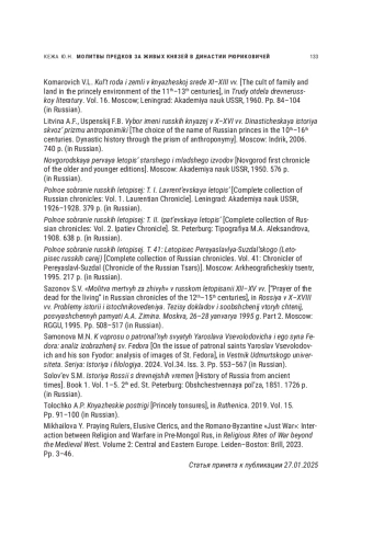 24. Sazonov S.V. “Molitva mertvyh za zhivyh” v russkom letopisanii XII-XV vv. [“Prayer of the dead for the living” in Russian chronicles of the 12th-15th centuries], in Rossiya v X-XVIII vv. Problemy istorii i istochnikovedeniya. Tezisy dokladov i soobshchenij vtoryh chtenij, posvyashchennyh pamyati A.A. Zimina. Moskva, 26-28 yanvarya 1995 g. Part 2. Moscow: RGGU, 1995. Pp. 508-517 (in Russian).