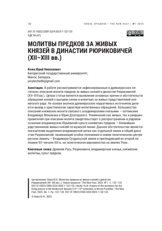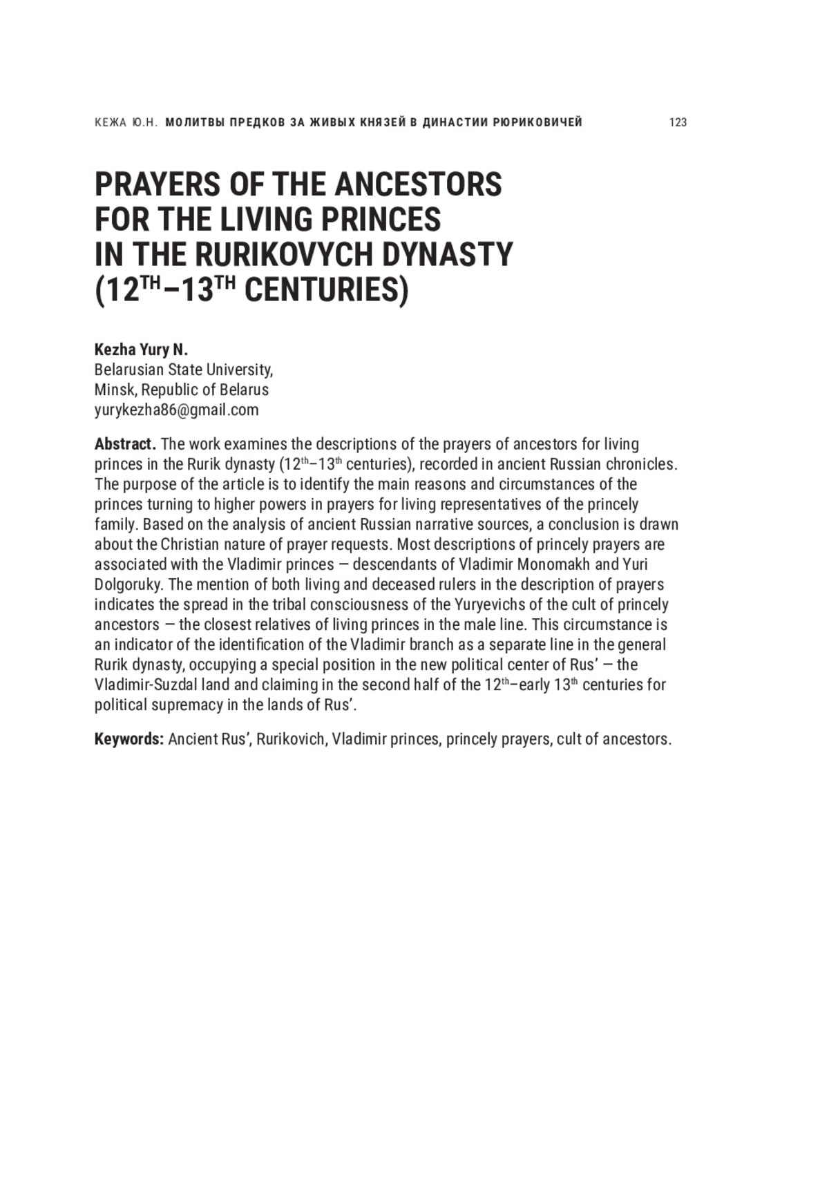 В работе рассматриваются зафиксированные в древнерусских летописях описания молитв предков за живых князей в династии Рюриковичей (XII–XIII вв.). Целью статьи является выявление основных причин и обстоятельств обращения князей к высшим силам в молитвах за живых представителей княжеского рода. На основе анализа древнерусских нарративных источников делается вывод о христианском характере молитвенных обращений. Большинство описаний княжеских молитв связано с владимирскими князьями — потомками Владимира Мономаха и Юрия Долгорукого. Упоминание как живых, так и умерших правителей при описании молитв свидетельствует о распространении в родовом сознании владимирских Юрьевичей культа княжеских предков — ближайших родственников живых князей по мужской линии. Данное обстоятельство является показателем выделения владимирской ветви как отдельной линии в общей династии Рюриковичей, занимающей особое положение в новом политическом центре русских земель — Владимиро-Суздальской земле и претендующей во второй половине ХІІ–начале ХІІІ в. на политическое верховенство на землях Руси