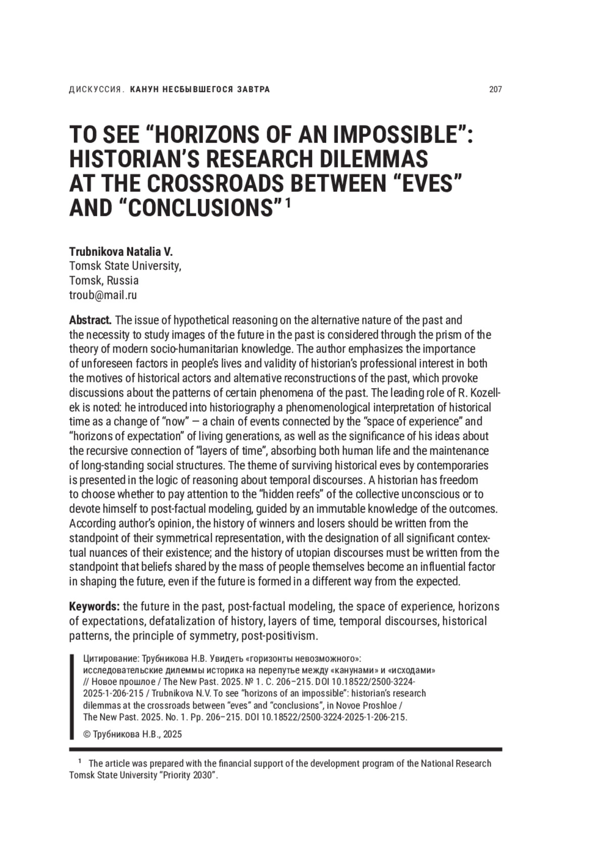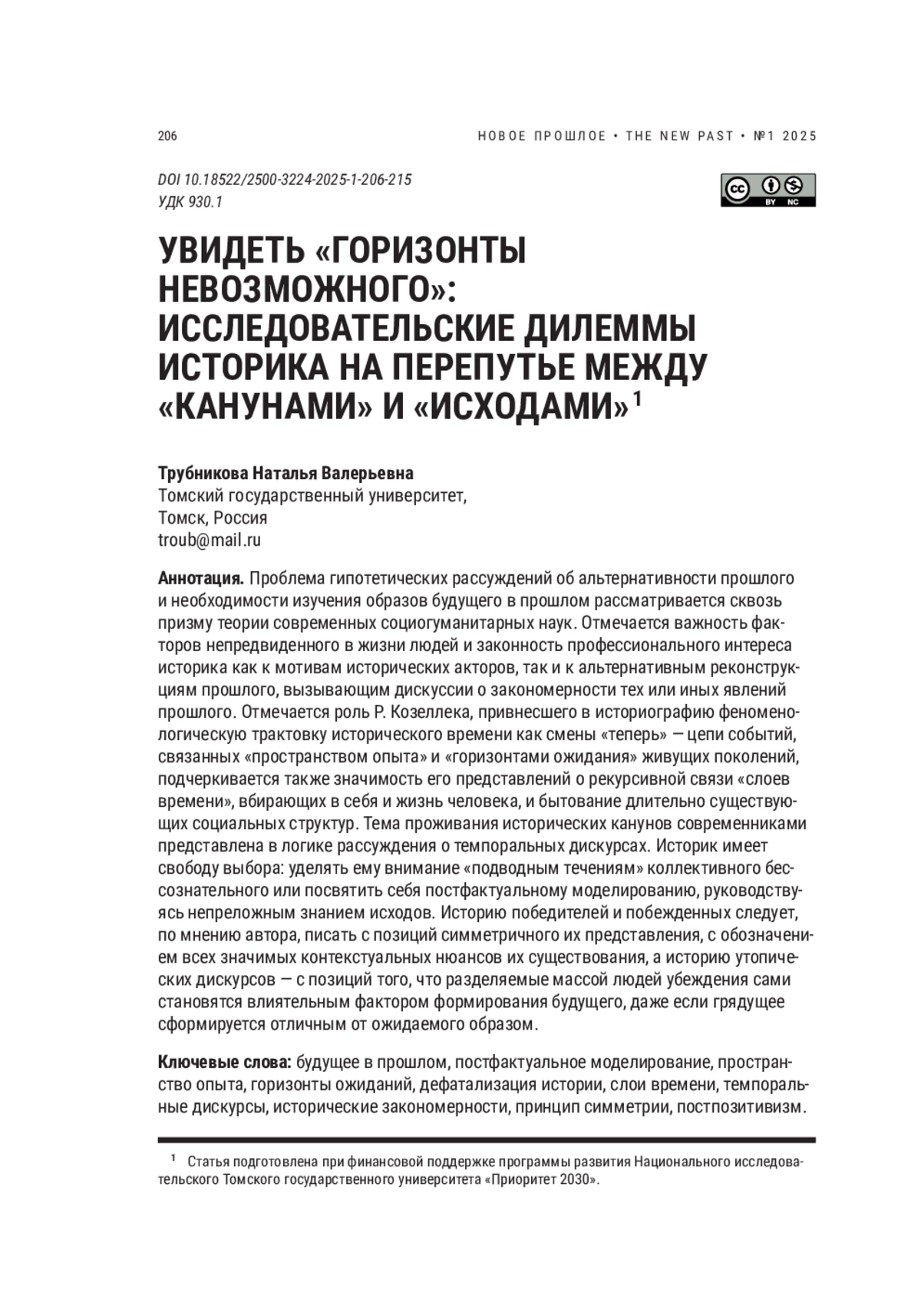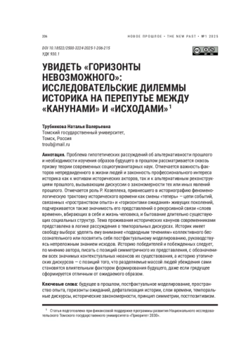 ТРУБНИКОВА Н. В. УВИДЕТЬ «ГОРИЗОНТЫ НЕВОЗМОЖНОГО»: ИССЛЕДОВАТЕЛЬСКИЕ ДИЛЕММЫ ИСТОРИКА НА ПЕРЕПУТЬЕ МЕЖДУ «КАНУНАМИ» И «ИСХОДАМИ» // НОВОЕ ПРОШЛОЕ. 2025. № 1