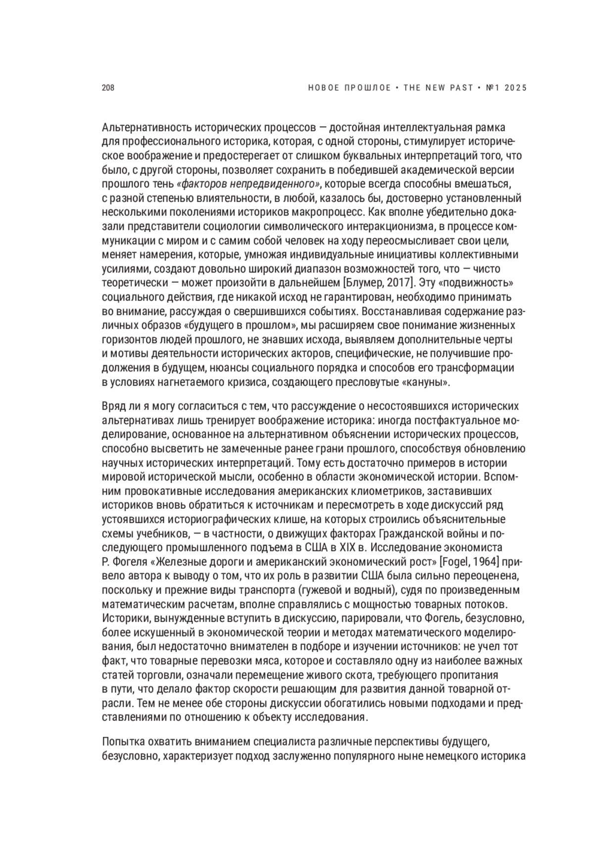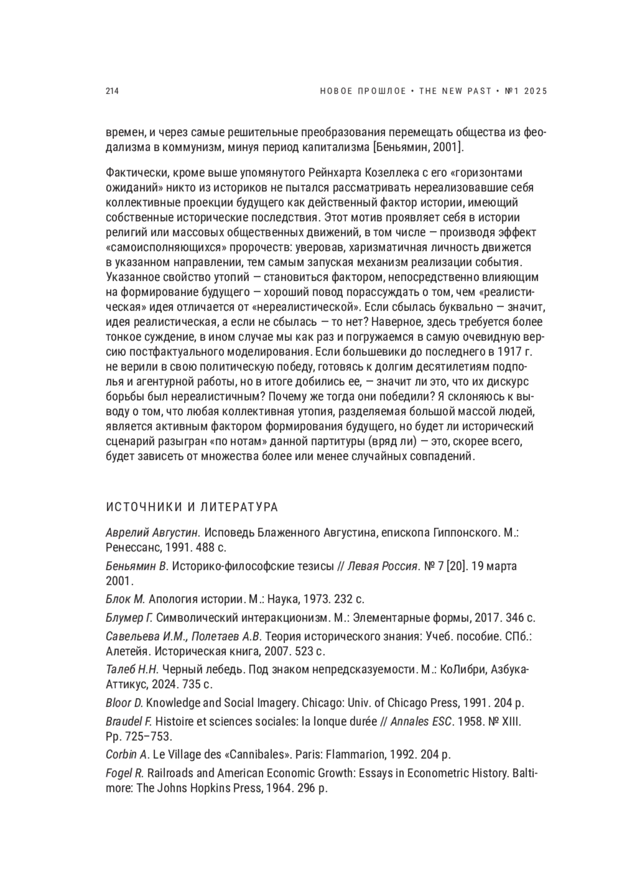 Проблема гипотетических рассуждений об альтернативности прошлого и необходимости изучения образов будущего в прошлом рассматривается сквозь призму теории современных социогуманитарных наук. Отмечается важность факторов непредвиденного в жизни людей и законность профессионального интереса историка как к мотивам исторических акторов, так и к альтернативным реконструкциям прошлого, вызывающим дискуссии о закономерности тех или иных явлений прошлого. Отмечается роль Р. Козеллека, привнесшего в историографию феноменологическую трактовку исторического времени как смены «теперь» — цепи событий, связанных «пространством опыта» и «горизонтами ожидания» живущих поколений, подчеркивается также значимость его представлений о рекурсивной связи «слоев времени», вбирающих в себя и жизнь человека, и бытование длительно существующих социальных структур. Тема проживания исторических канунов современниками представлена в логике рассуждения о темпоральных дискурсах. Историк имеет свободу выбора: уделять ему внимание «подводным течениям» коллективного бессознательного или посвятить себя постфактуальному моделированию, руководствуясь непреложным знанием исходов. Историю победителей и побежденных следует, по мнению автора, писать с позиций симметричного их представления, с обозначением всех значимых контекстуальных нюансов их существования, а историю утопических дискурсов — с позиций того, что разделяемые массой людей убеждения сами становятся влиятельным фактором формирования будущего, даже если грядущее сформируется отличным от ожидаемого образом