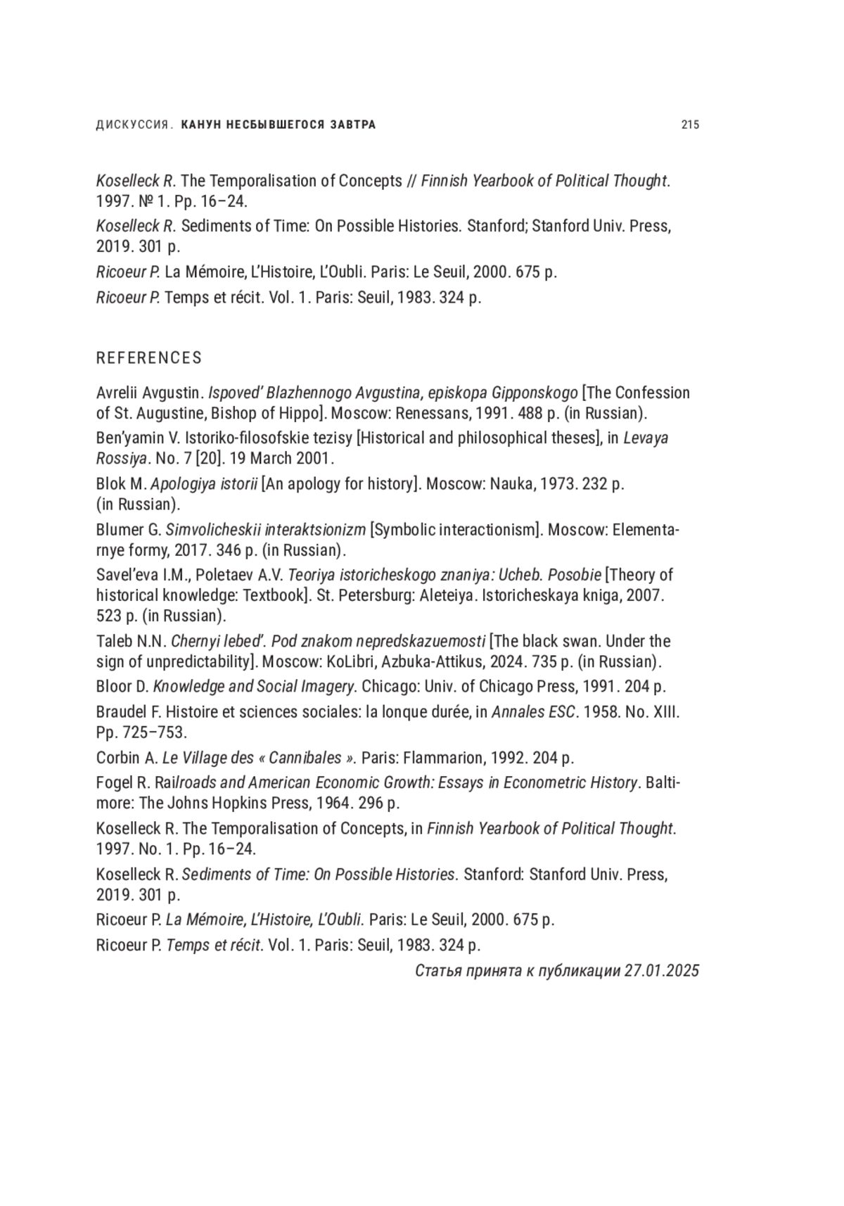 Ключевые фразы: будущее в прошлом, постфактуальное моделирование, пространство опыта, горизонты ожиданий, дефатализация истории, слои времени, темпоральные дискурсы, исторические закономерности, принцип симметрии, постпозитивизм