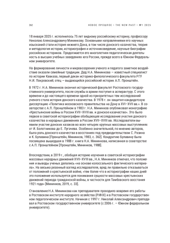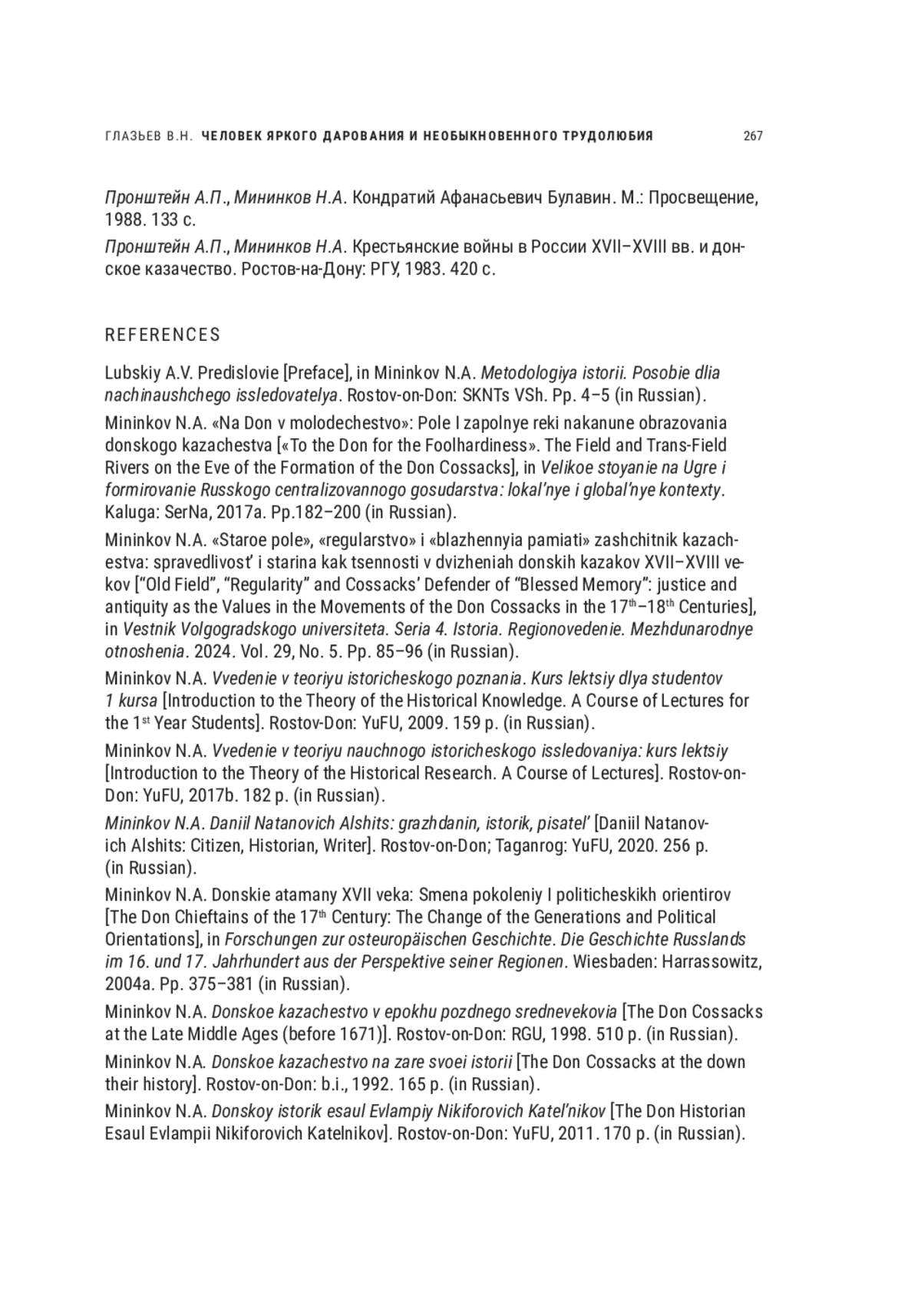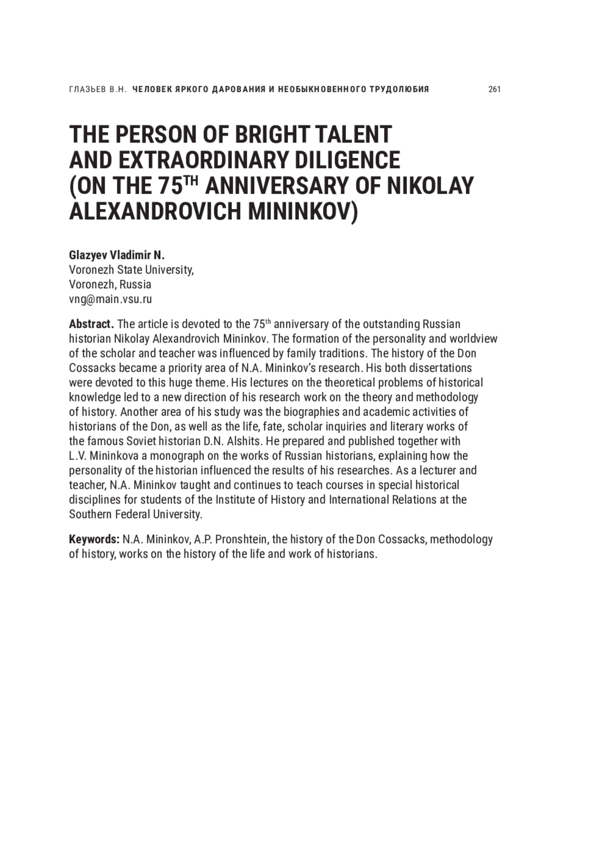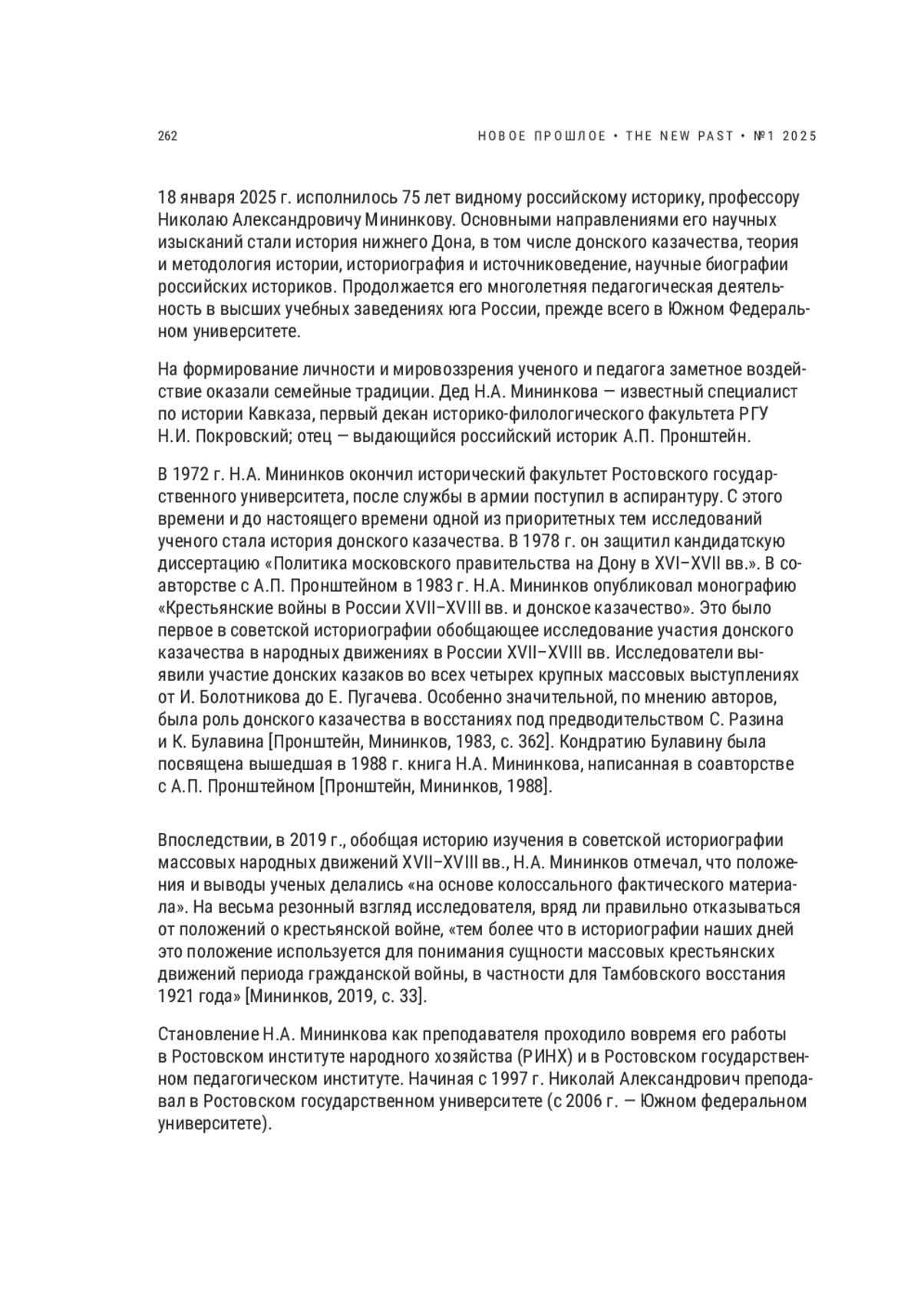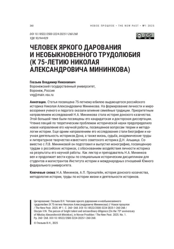 ГЛАЗЬЕВ В. Н. ЧЕЛОВЕК ЯРКОГО ДАРОВАНИЯ И НЕОБЫКНОВЕННОГО ТРУДОЛЮБИЯ (К 75-ЛЕТИЮ НИКОЛАЯ АЛЕКСАНДРОВИЧА МИНИНКОВА) // НОВОЕ ПРОШЛОЕ. 2025. № 1