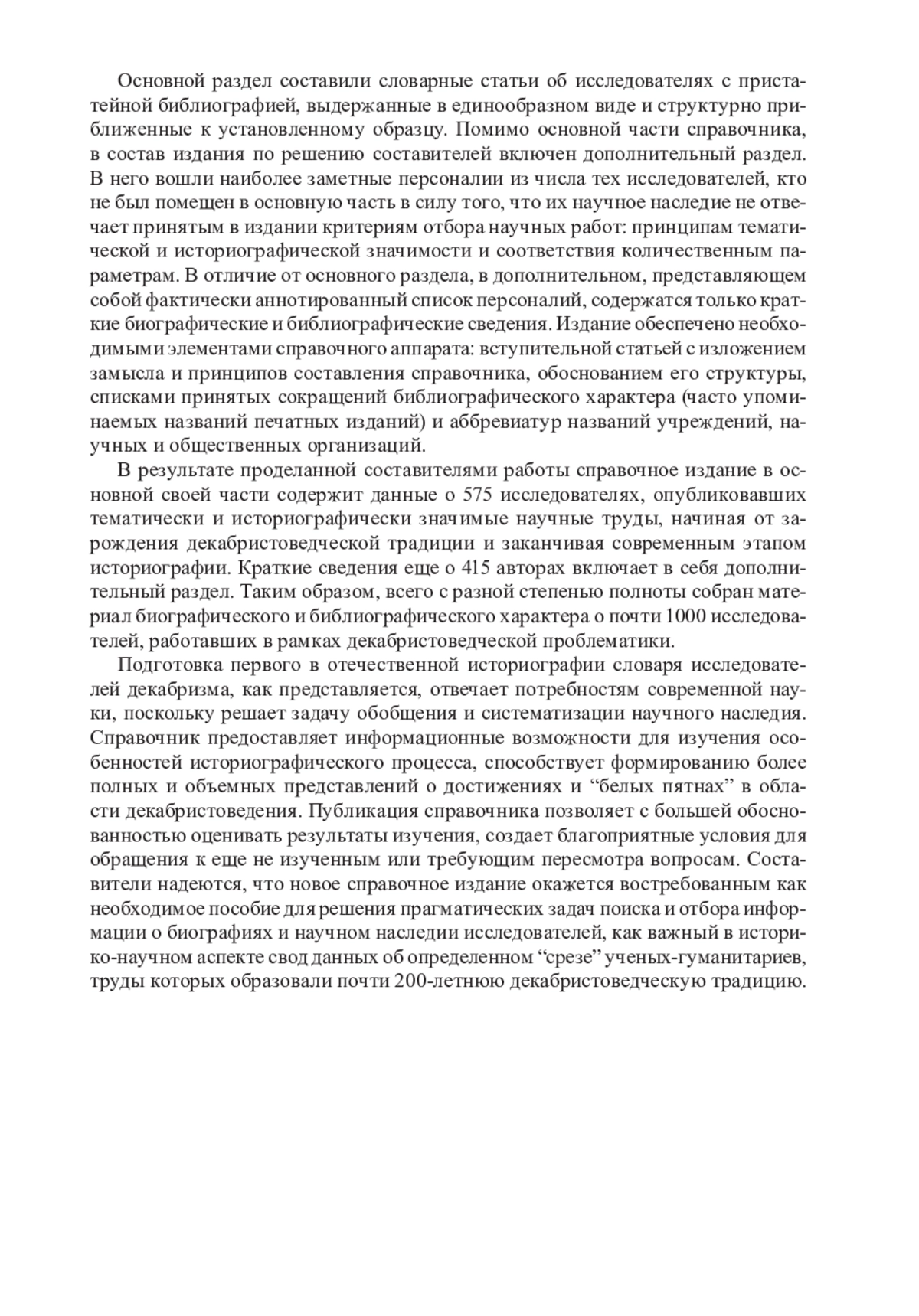 История декабризма – одно из плодотворно развивающихся в течение многих десятилетий направлений в изучении российских политических движений и общественно-политической мысли. Широкий фронт научных работ в этой тематической области, начиная со второй половины XIX в. и до настоящего времени, привлечение к нему интереса специалистов, представляющих различные гуманитарные науки – историков, филологов, правоведов, экономистов, философов, культурологов, искусствоведов, привели к формированию значительной научной традиции, появлению большого массива исследовательских трудов, документальных публикаций, источниковедческих, текстологических и археографических разработок, историографических обзоров и т. д. Тематическое поле декабристоведческих исследований привлекло к себе особое внимание библиографов: на протяжении 1920–1990-х гг. вышли в свет четыре основополагающих и несколько дополнительных библиографических указателей, содержащих практически полную информацию о вышедших в свет научных, научнопопулярных и прочих трудах, вплоть до начала 1990-х гг.1