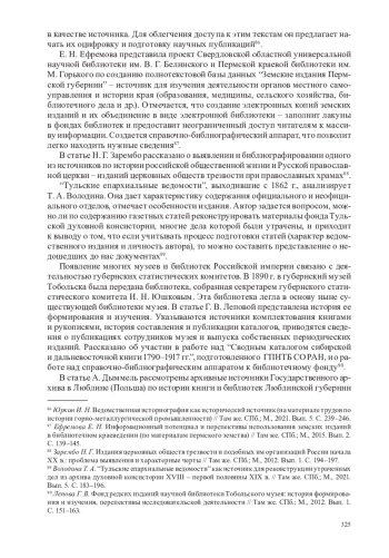 90. Ефремова Е. Н. Информационный потенциал и перспективы использования земских изданий в библиотечном краеведении (по материалам пермского земства) // Библиография. Археография. Источниковедение: сб. ст. и материалов / ред.-сост. А. И. Раздорский, Д. Н. Шилов. СПб., М., 2015. Вып. 2. С. 139-145. EDN: VOZCJN