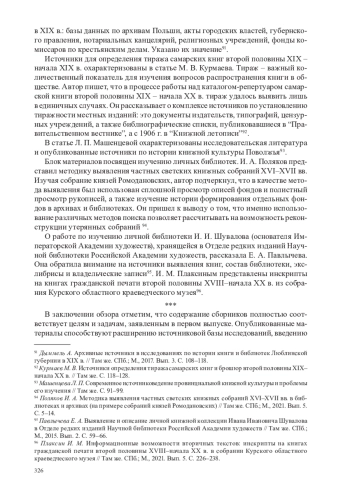 99. Плаксин И. М. Информационные возможности вторичных текстов: инскрипты на книгах гражданской печати второй половины ХѴIII-начала XX в. в собрании Курского областного краеведческого музея // Библиография. Археография. Источниковедение: сб. ст. и материалов / ред.-сост. А. И. Раздорский, Д. Н. Шилов. СПб., М., 2021. Вып. 5. С. 226-238.