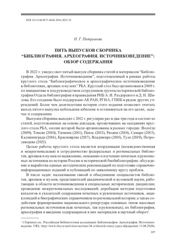 В 2022 г. увидел свет пятый выпуск сборника статей и материалов “Библиография. Археография. Источниковедение”, подготовленный в рамках работы круглого стола “Библиографическое и археографическое источниковедение в библиотеках, архивах и музеях” РБА. Круглый стол был организован в 2009 г. по инициативе и под руководством сотрудников группы исторической библиографии Отдела библиографии и краеведения РНБ А. И. Раздорского и Д. Н. Шилова. Его создание было поддержано АК РАН, РГИА, ГПИБ и рядом других учреждений. Более чем десятилетняя история этого издания позволяет считать выход пятого выпуска небольшим юбилеем и остановиться на его целях, задачах и содержании.