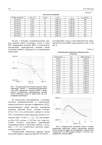 Среднее значение времени жизни неосновных носителей заряда по измеренным слоям КРТ р-типа проводимости, выращенным методом ЖФЭ, составило 82,3 нс. Причиной столь невысоких значений времени жизни считается наличие рекомбинационных центров ШРХ, связанных с вакансиями Hg [24], что подтверждено расчетами температурных зависимостей времени жизни в КРТ р-типа проводимости.