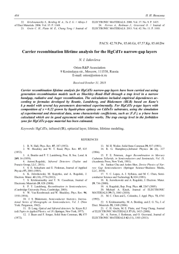 N. I. Iakovleva Carrier recombination lifetime analysis for the HgCdTe narrow-gap layers 476
