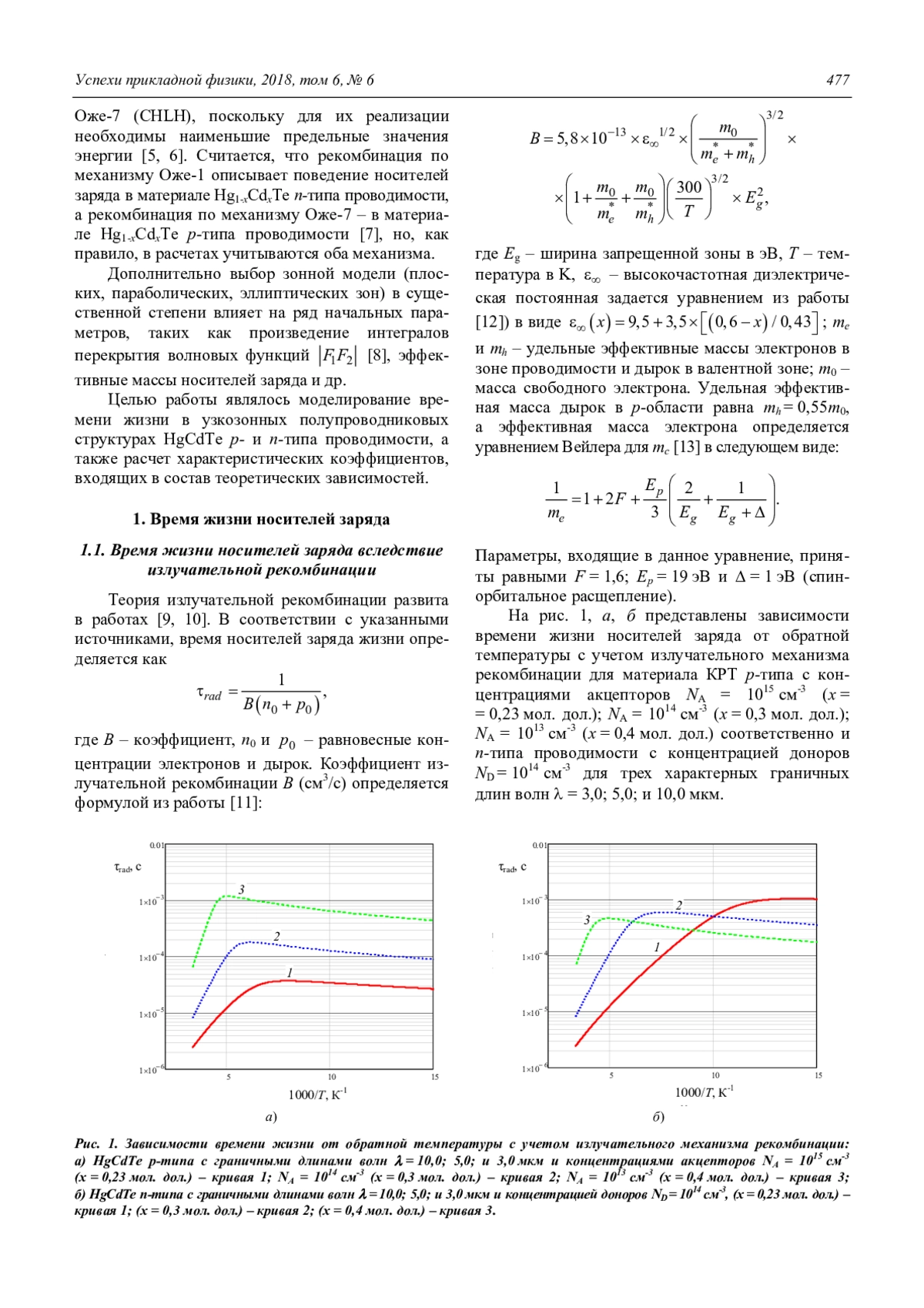 Генерационно-рекомбинационные процессы в HgCdTe непосредственно связаны как с механизмами детектирования фотонов, так и механизмами возникновения шума в фотоэлектронных инфракрасных (ИК) устройствах, а поэтому играют важную роль при расчетах основных фотоэлектрических параметров. В данной работе представлены результаты моделирования времени жизни в узкозонных полупроводниковых структурах HgCdTe р- и n-типа проводимости в соответствии с механизмами рекомбинации Оже, излучательным и Шокли-Рида-Холла, используя эмпирические формулы Битти, Ландсберга и Блэкмора (BLB).