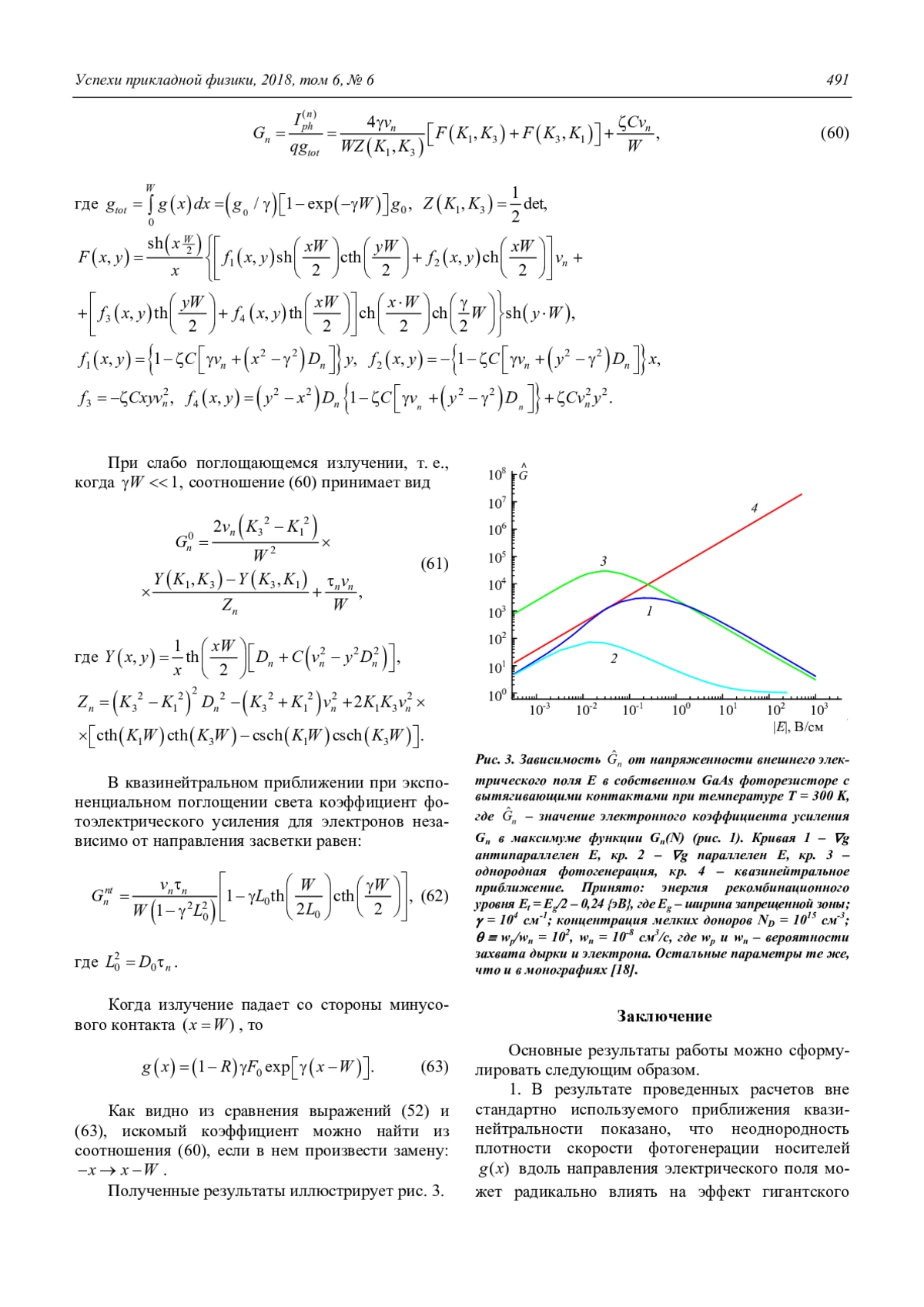 1. В результате проведенных расчетов вне стандартно используемого приближения квазинейтральности показано, что неоднородность плотности скорости фотогенерации носителей g(x) вдоль направления электрического поля может радикально влиять на эффект гигантского всплеска коэффициента усиления G в пороговых собственных фоторезисторах при увеличении концентрации центров рекомбинации N. Это влияние тем больше, чем больше g(x).
