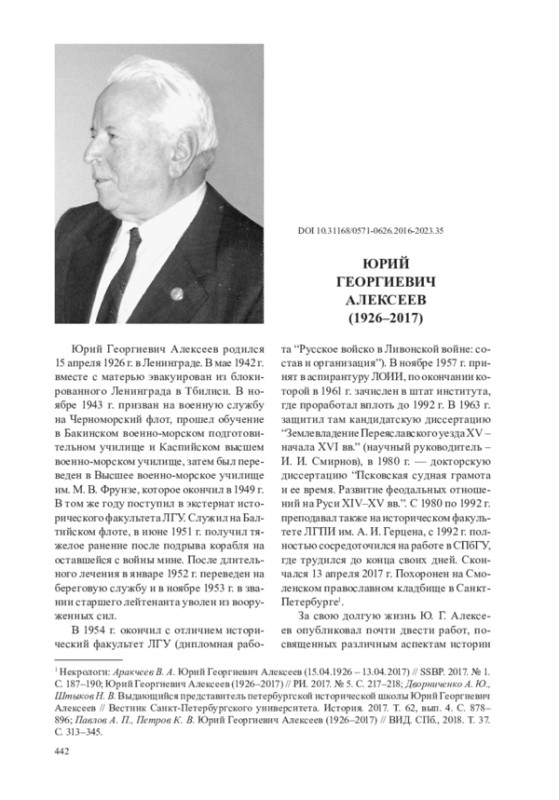 2. Юрий Георгиевич Алексеев (1926-2017)// Российская история. 2017. № 5. С. 217-218. EDN: ZFXCYF
