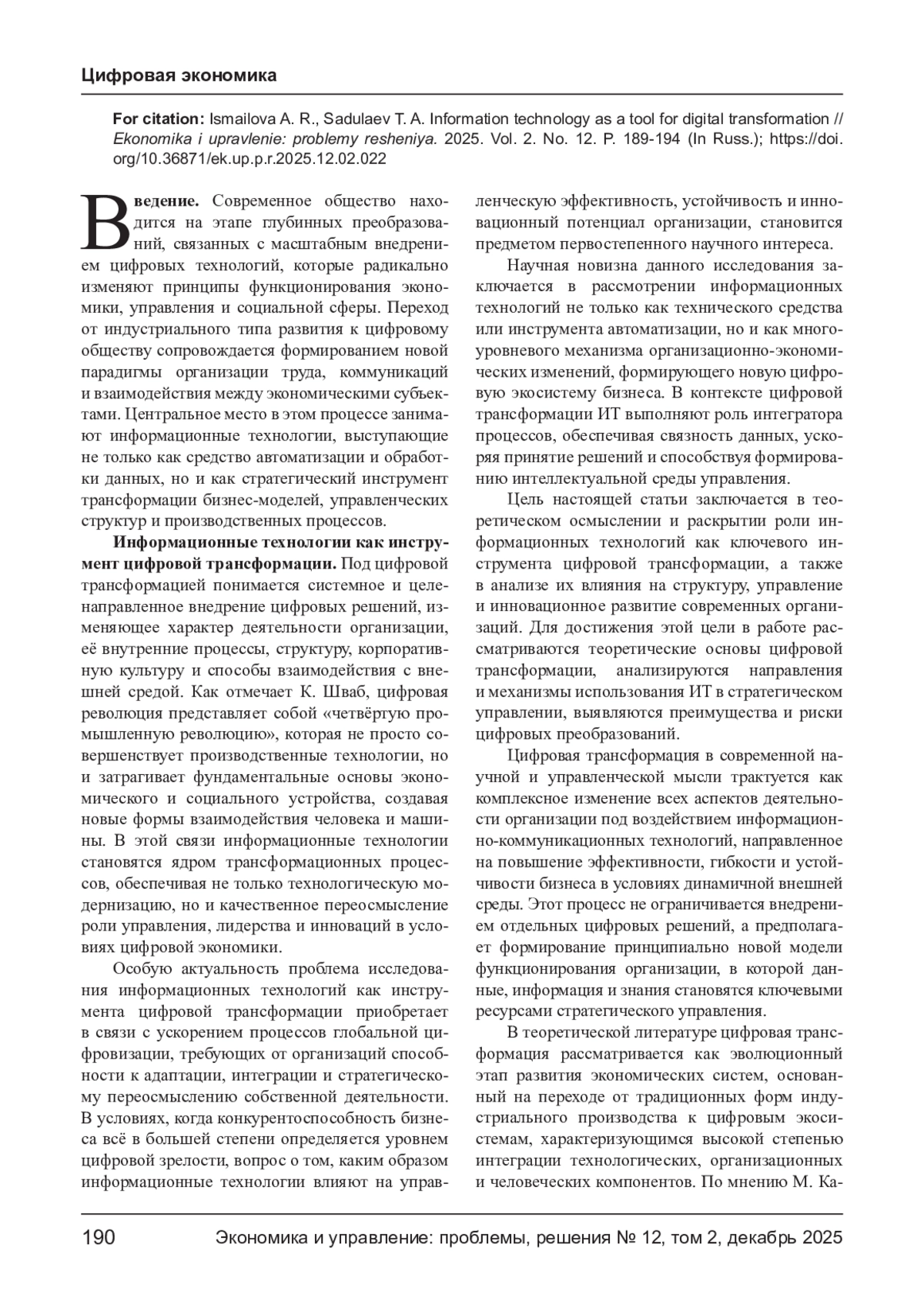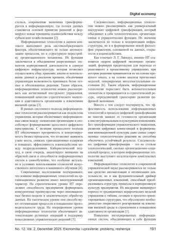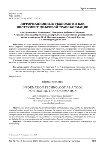 В статье рассматривается роль информационных технологий как ключевого инструмента цифровой трансформации современного общества и экономики. Раскрываются сущность и содержание цифровой трансформации, анализируются механизмы, посредством которых информационные технологии обеспечивают структурные изменения в деятельности организаций, управлении, производстве и взаимодействии с потребителями. Обосновывается тезис о том, что информационные технологии не только способствуют повышению эффективности и прозрачности процессов, но и формируют новую управленческую и корпоративную культуру, ориентированную на данные и инновации.