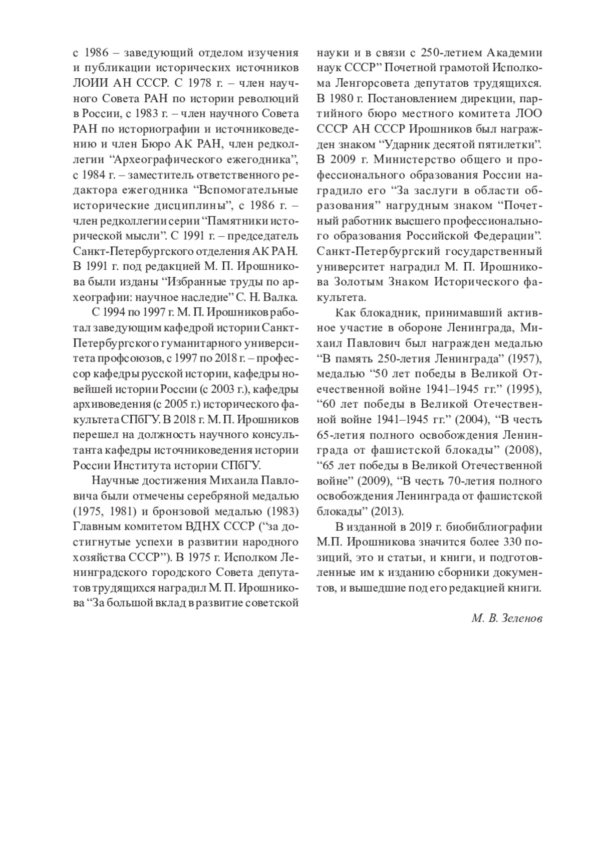 ЗЕЛЕНОВ М. В. МИХАИЛ ПАВЛОВИЧ ИРОШНИКОВ (1934–2019)* // АРХЕОГРАФИЧЕСКИЙ ЕЖЕГОДНИК. 2024. ТОМ 1