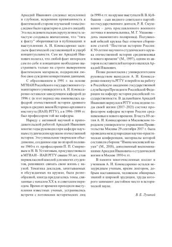 Вехи научной биографии крупного отечественного историка, доктора исторических наук профессора А. И. Комиссаренко известны достаточно хорошо. Выпускник Московского государственного-историко-архивного института 1959 г., ученик профессора Н. В. Устюгова (“устюговец”), в 1961–1991 гг. аспирант, старший преподаватель, доцент, профессор МГИАИ, в 1976– 1991 гг. возглавлявший в МГИАИ кафедру истории СССР досоветского периода, Аркадий Иванович избрал основной сферой своей научной деятельности историю России периода позднего феодализма, сосредоточившись на тематике XVII–XVIII вв. Его интерес к социально-экономической истории был обусловлен, с одной стороны, влиянием Н. В. Устюгова и его школы, с другой – впечатлением от фундаментальной монографии академика Н. М. Дружинина “Государственные крестьяне и реформа П. Д. Киселева”, прочитанной Аркадием Ивановичем еще в студенческие годы.