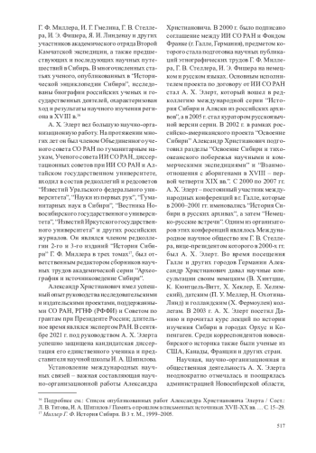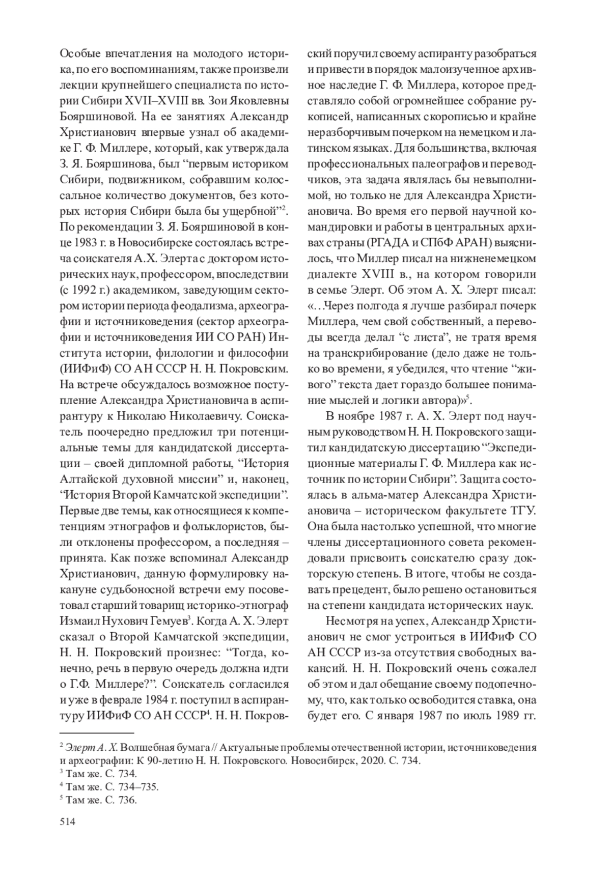 26 ноября 2022 г. не стало Александра Христиановича Элерта – выдающегося ученого, ведущего специалиста в области истории Сибири XVII–XVIII вв., российских академических экспедиций XVIII в., археографии и источниковедения отечественной истории, исторической этнографии и лингвистики коренных народов Сибири. Широкую известность и признание российского и мирового научного сообщества А. Х. Элерт получил благодаря миллероведению – введению в оборот и системному анализу исторических, этнографических, лингвистических, археологических, географических, трудов и материалов комплексного характера из богатейшего научного наследия академика Г. Ф. Миллера, полученных им в ходе и по результатам Второй Камчатской экспедиции (1733–1743) и имеющих фундаментальное значение для истории российской науки и ее отдельных дисциплин.
