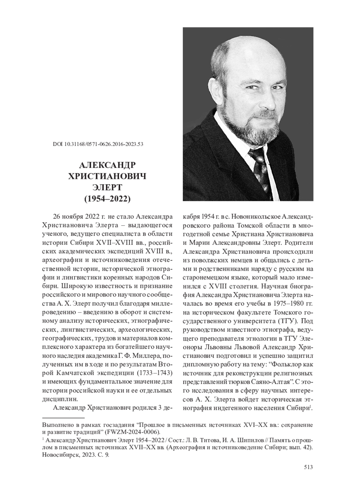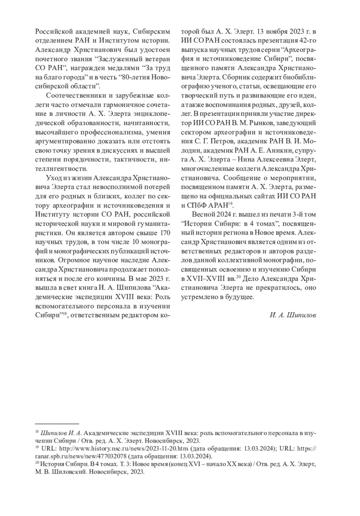 1. Александр Христианович Элерт 1954-2022 / Сост.: Л. В. Титова, И. А. Шипилов // Память о прошлом в письменных источниках ХѴII-ХХ вв. (Археография и источниковедение Сибири, вып. 42). Новосибирск, 2023. С. 9.