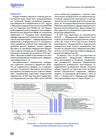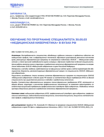 Востребованность специалистов, обладающих глубокими знаниями в предметных областях как медицинского профиля, так и информационных технологий, обусловила существенное увеличение количества вузов, реализующих образовательную программу по направлению подготовки 30.05.03 — «Медицинская кибернетика» и стала причиной необходимости оценки ситуации с обучением студентов по данной специальности. Целью работы является анализ структуры и предметного наполнения образовательной программы по направлению подготовки 30.05.03 «Медицинская кибернетика» в вузах Российской Федерации.