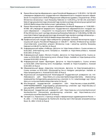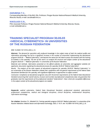 Результаты исследования. Анализ основных аспектов образовательных программ по специальности 30.05.03 «Медицинская кибернетика» в десяти вузах РФ показал их соответствие общим требованиям ФГОС по данной специальности при существенном различии в подходах к предметному наполнению.
