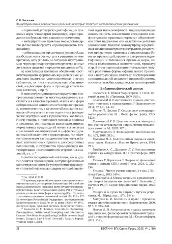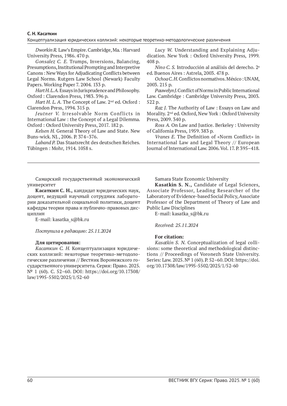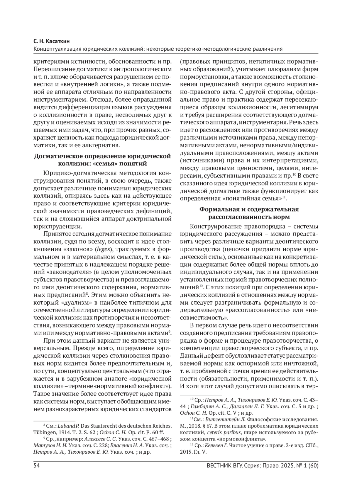 КАСАТКИН С. Н. КОНЦЕПТУАЛИЗАЦИЯ ЮРИДИЧЕСКИХ КОЛЛИЗИЙ: НЕКОТОРЫЕ ТЕОРЕТИКОМЕТОДОЛОГИЧЕСКИЕ РАЗЛИЧЕНИЯ // ВЕСТНИК ВОРОНЕЖСКОГО ГОСУДАРСТВЕННОГО УНИВЕРСИТЕТА. СЕРИЯ: ПРАВО. 2025. № 1 (60)