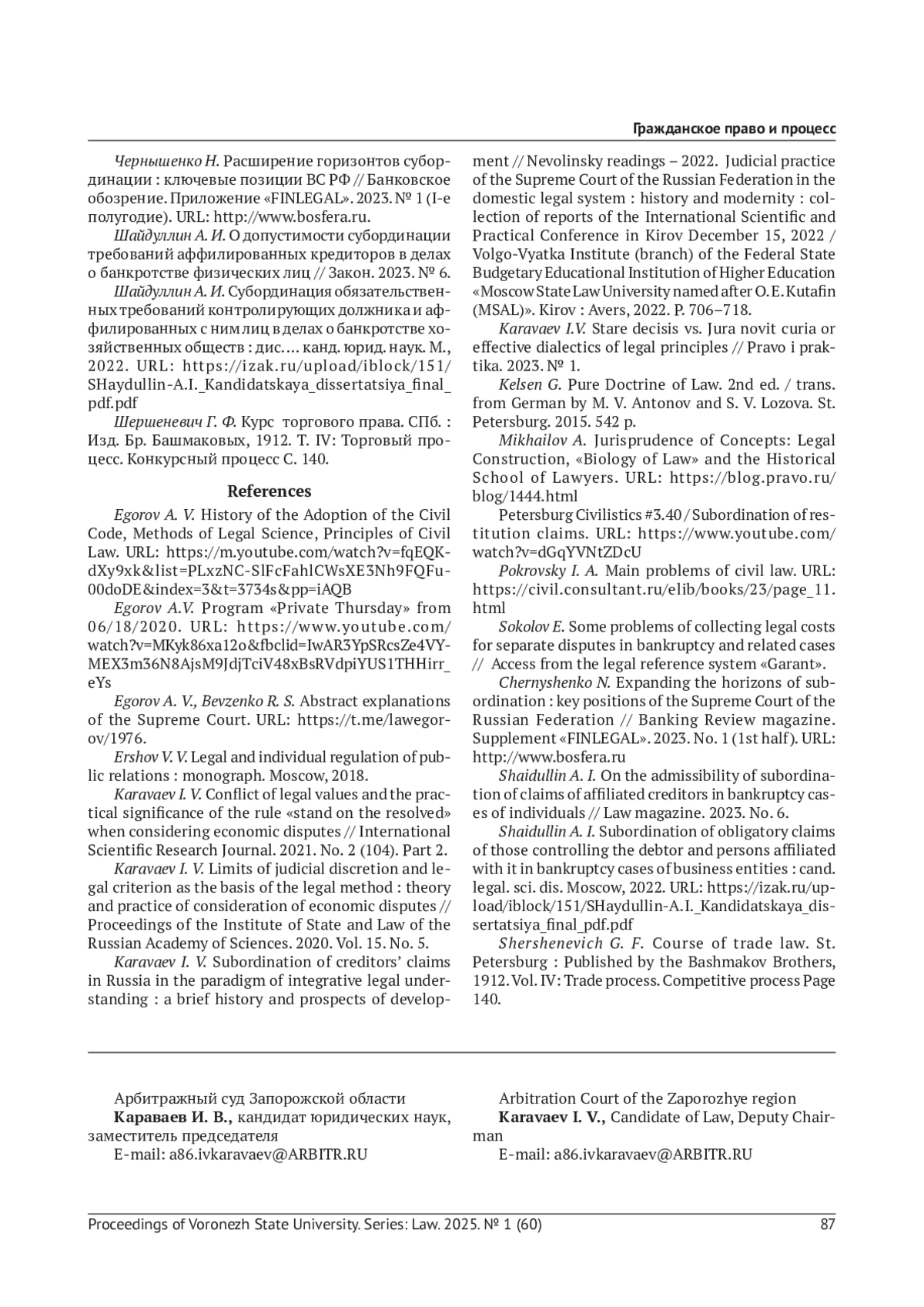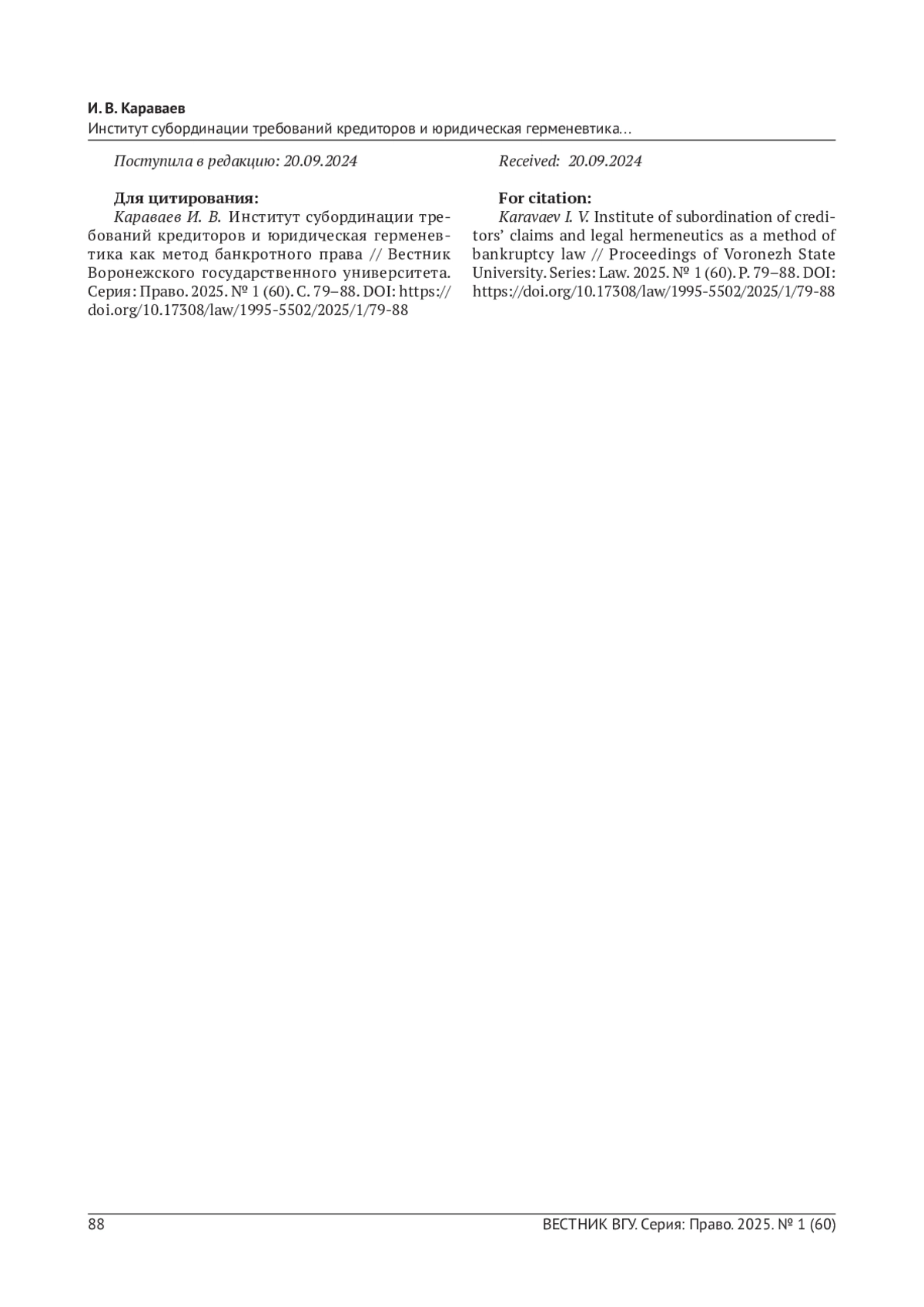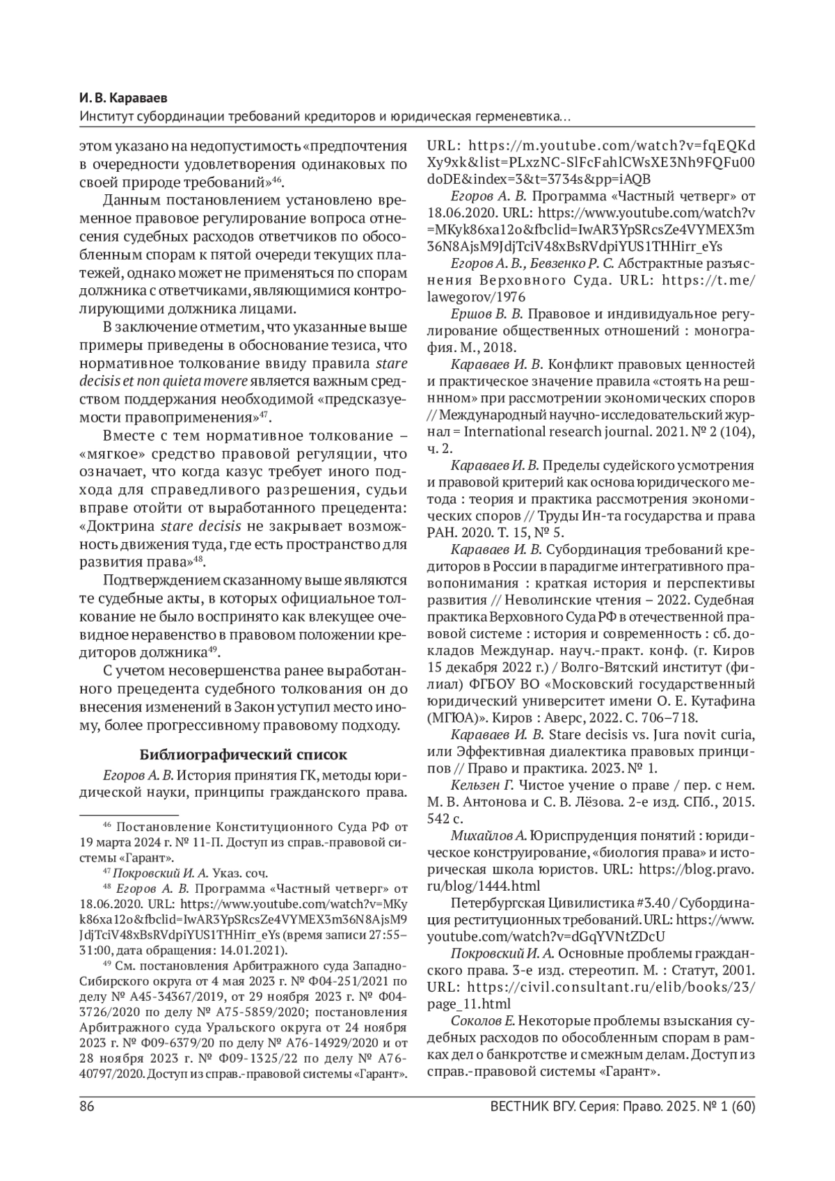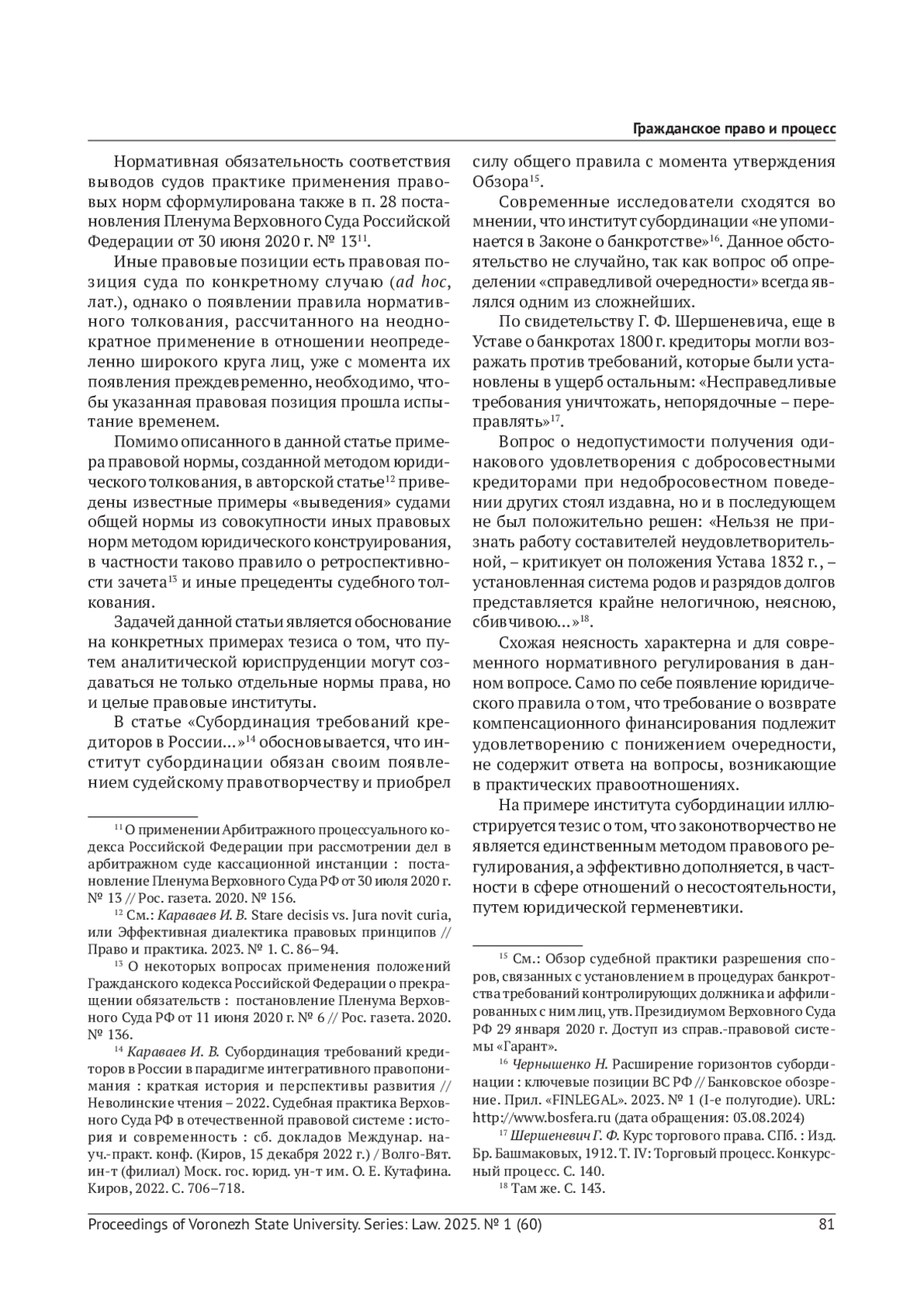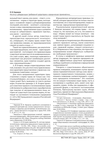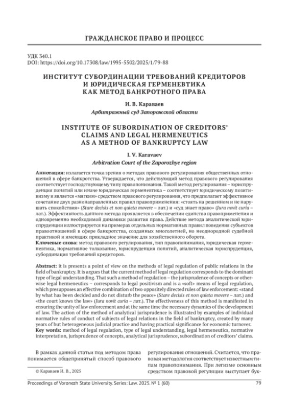 КАРАВАЕВ И. В. ИНСТИТУТ СУБОРДИНАЦИИ ТРЕБОВАНИЙ КРЕДИТОРОВ И ЮРИДИЧЕСКАЯ ГЕРМЕНЕВТИКА КАК МЕТОД БАНКРОТНОГО ПРАВА // ВЕСТНИК ВОРОНЕЖСКОГО ГОСУДАРСТВЕННОГО УНИВЕРСИТЕТА. СЕРИЯ: ПРАВО. 2025. № 1 (60)