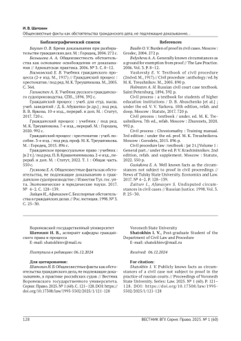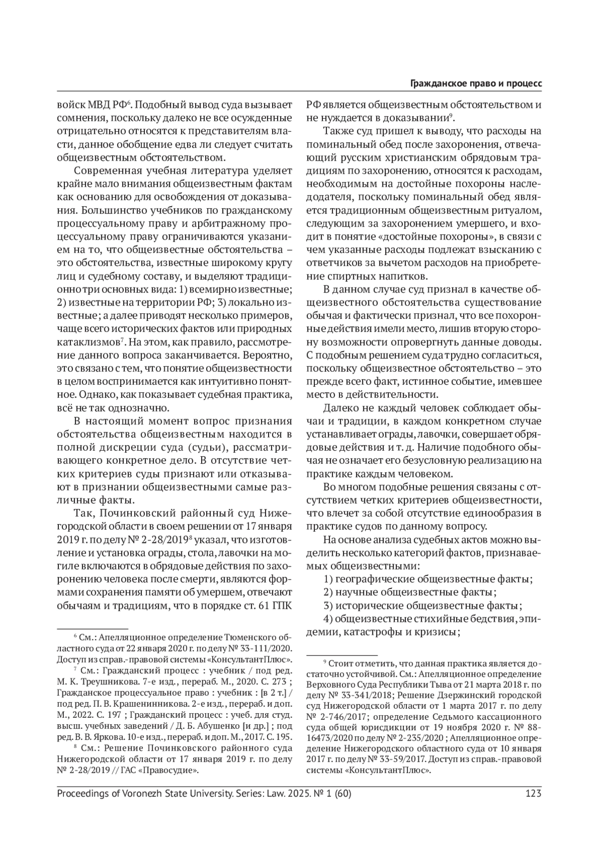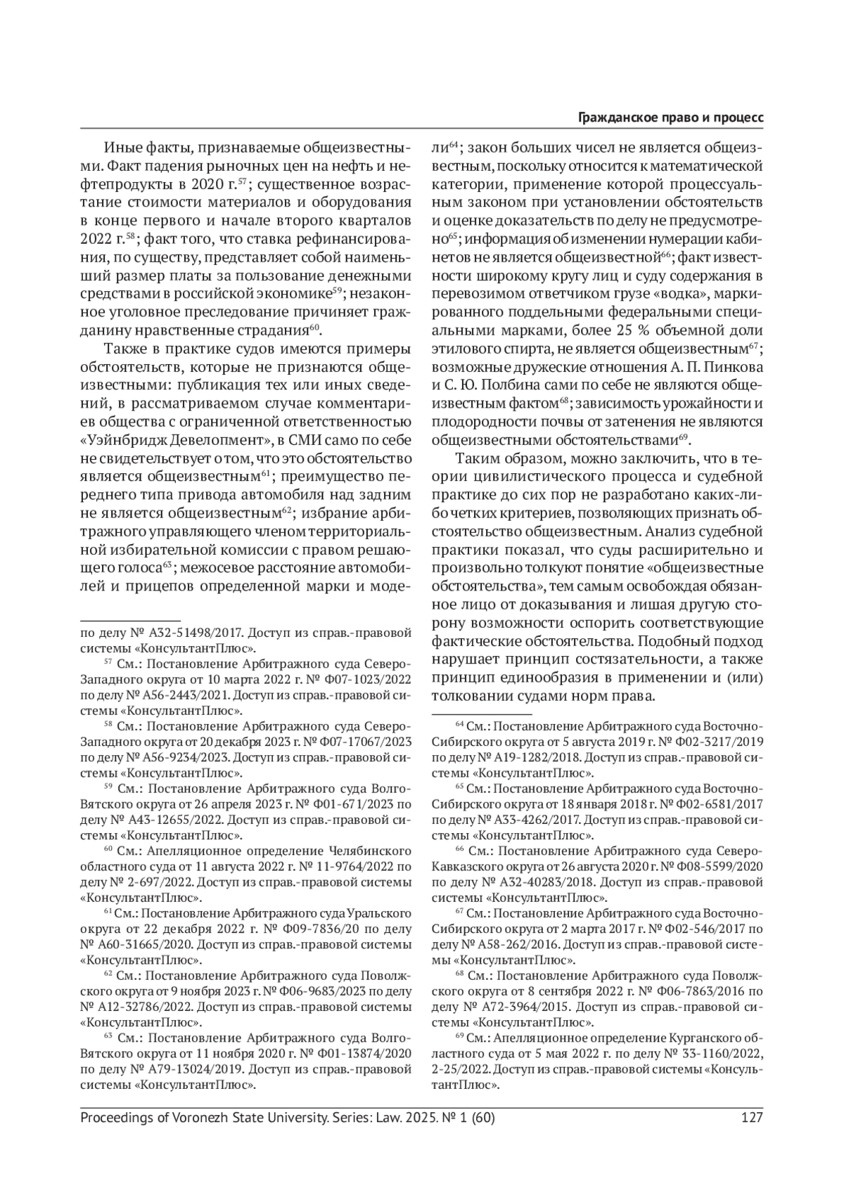 ШАТОХИН И.В. ОБЩЕИЗВЕСТНЫЕ ФАКТЫ КАК ОБСТОЯТЕЛЬСТВА ГРАЖДАНСКОГО ДЕЛА, НЕ ПОДЛЕЖАЩИЕ ДОКАЗЫВАНИЮ, В ПРАКТИКЕ РОССИЙСКИХ СУДОВ // ВЕСТНИК ВОРОНЕЖСКОГО ГОСУДАРСТВЕННОГО УНИВЕРСИТЕТА. СЕРИЯ: ПРАВО. 2025. № 1 (60)