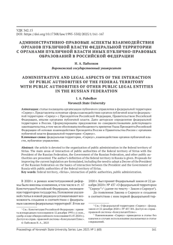 Статья посвящена организации публичного управления в федеральной территории «Сириус». Представлены основные сферы взаимодействия органов публичной власти федеральной территории «Сириус» с Президентом Российской Федерации, Правительством Российской Федерации, иными органами публичной власти. Дано авторское определение федеральной территории в России. Сформулированы предложения по совершенствованию действующего законодательства, в том числе обоснована необходимость принятия Указа Президента Российской Федерации об основах взаимодействия Президента России и Правительства России с органами публичной власти федеральной территории «Сириус».