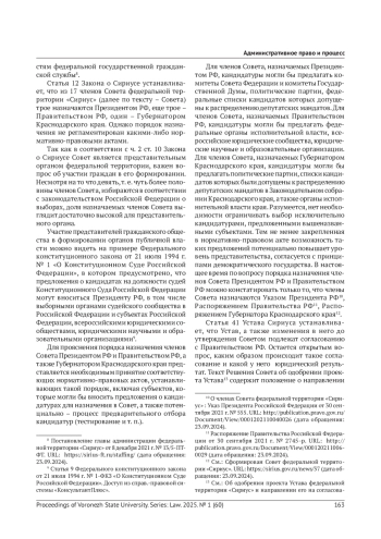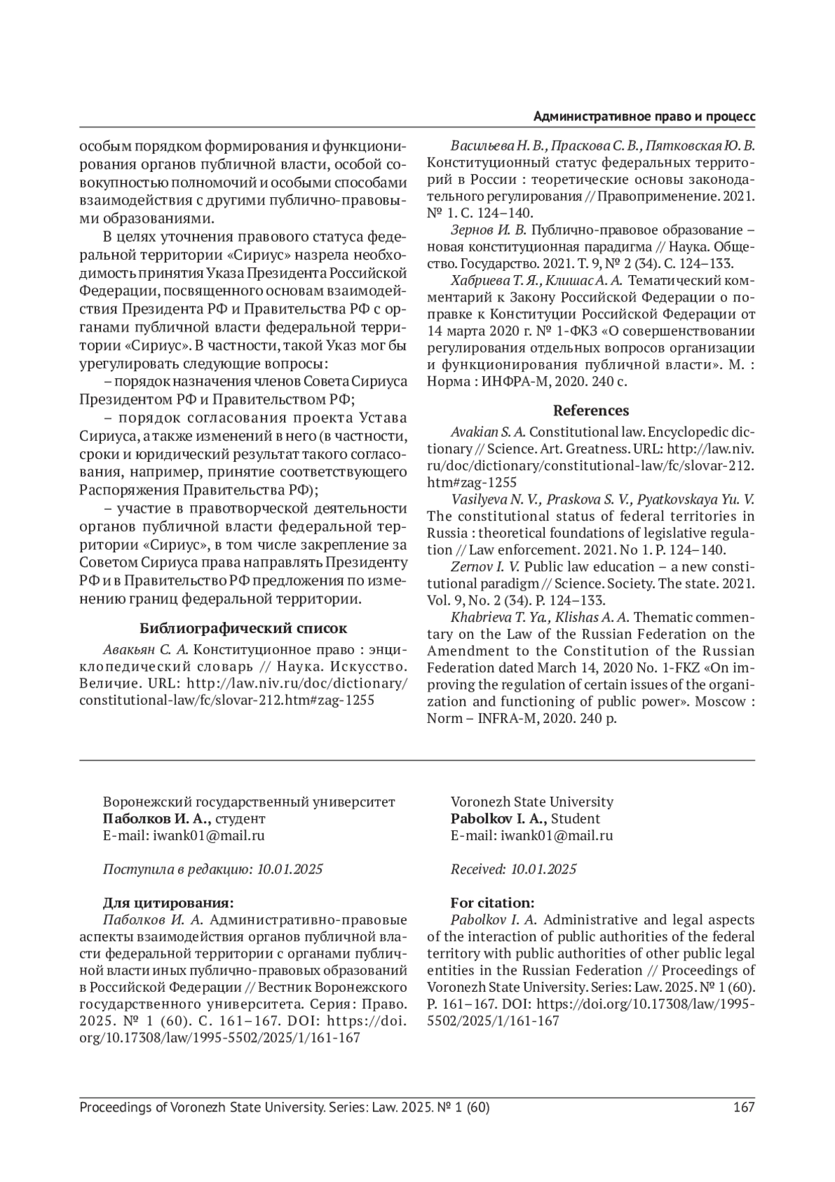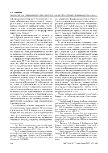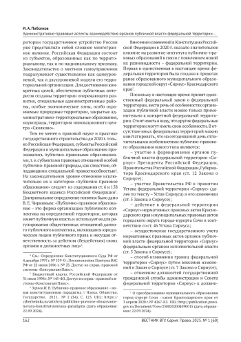 2. Васильева Н. В., Праскова С. В., Пятковская Ю. В. Конституционный статус федеральных территорий в России: теоретические основы законодательного регулирования // Правоприменение. 2021. № 1. С. 124-140. EDN: OWUZAH