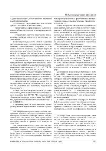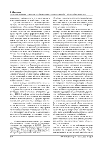 Преимуществами (сильными сторонами) комплексного юридического образования являются следующие. Вопервых, возможность подготовить специалиста, обладающего знаниями, умениями и навыками в различных областях, которые органично соединены и направлены на решение задач в одной профессиональной сфере. Например, подготовка эксперта в области экономических экспертиз обеспечивает возможность его функционирования в качестве специалиста в любом виде судопроизводства и иных видах юрисдикционной деятельности, где имеется необходимость в проведении экономических экспертиз, а также осуществление консультационной деятельности по вопросам использования специальных экономических знаний. Вовторых, внушительный объем подготовки будущего судебного эксперта по юридическим дисциплинам позволяет утверждать о его возможности функционировать в качестве юриста, в том числе узкопрофильного, например юрист в финансовой и экономической сфере.