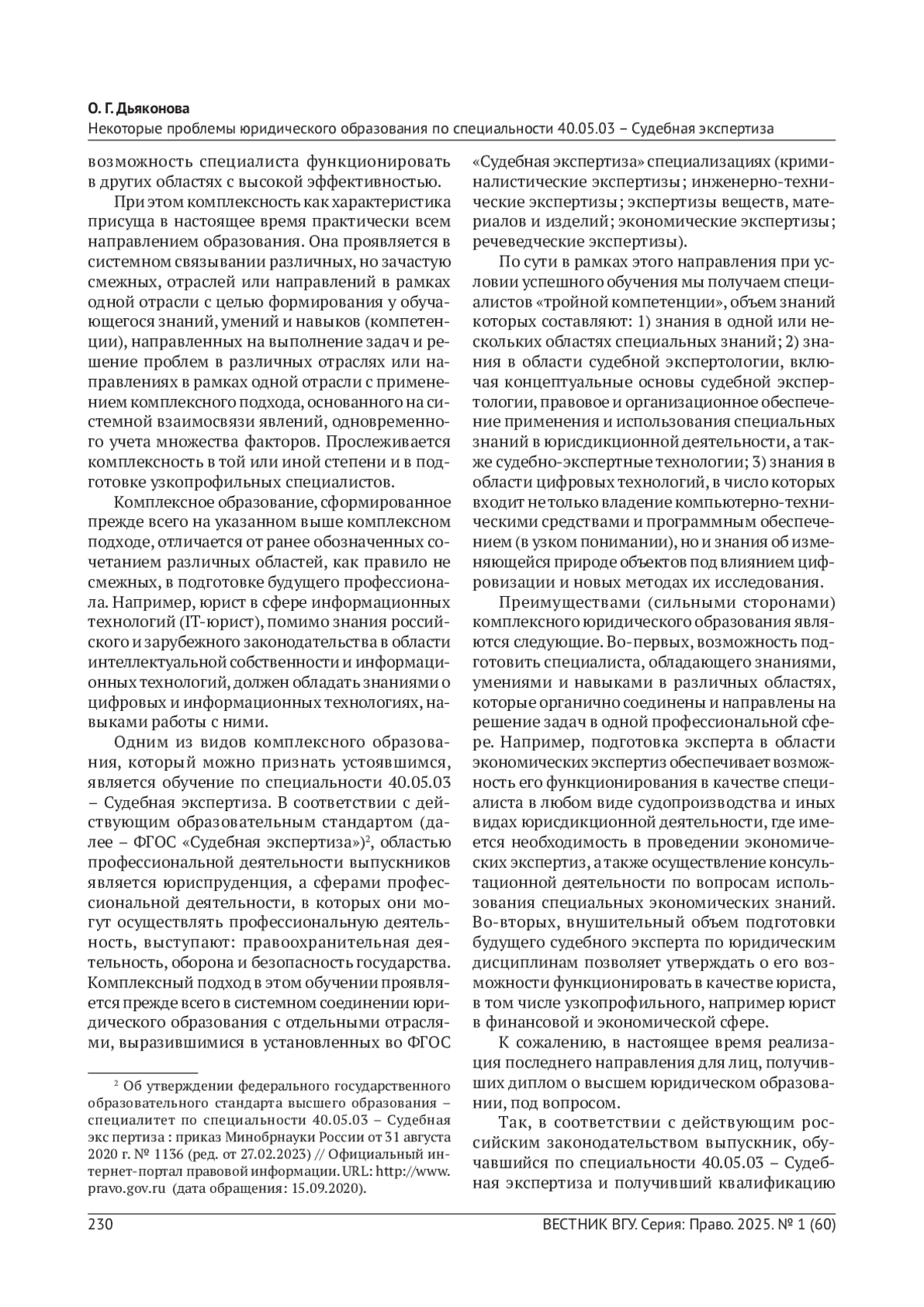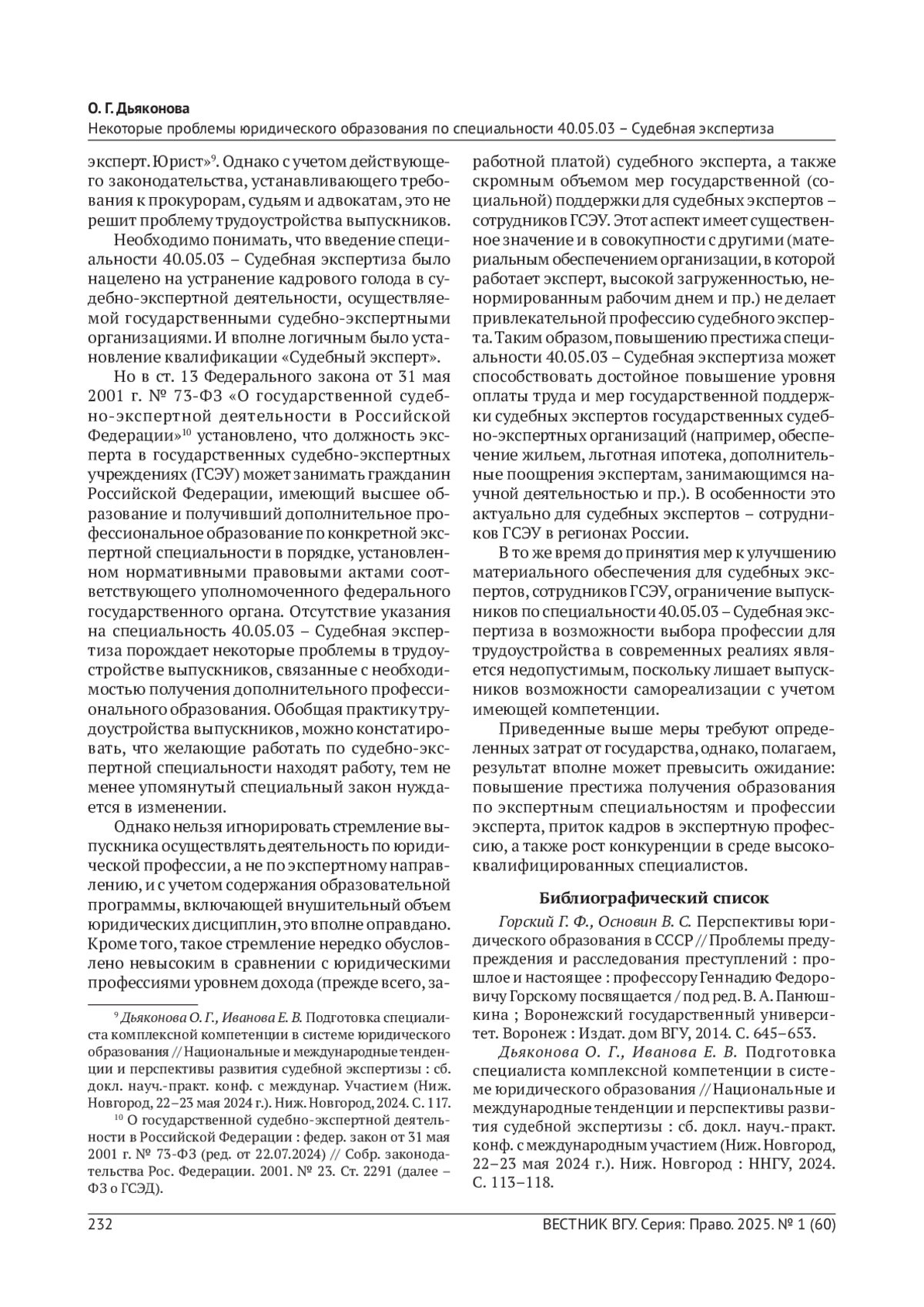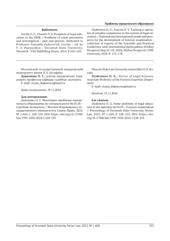 2. Дьяконова О. Г., Иванова Е. В. Подготовка специалиста комплексной компетенции в системе юридического образования // Национальные и международные тенденции и перспективы развития судебной экспертизы: сб. докл. науч.-практ. конф. с международным участием (Ниж. Новгород, 22-23 мая 2024 г.). Ниж. Новгород: ННГУ, 2024. С. 113-118. EDN: BGLQVU