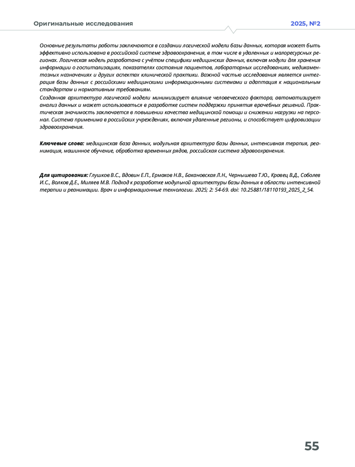 Основные результаты работы заключаются в создании логической модели базы данных, которая может быть эффективно использована в российской системе здравоохранения, в том числе в удаленных и малоресурсных регионах. Логическая модель разработана с учётом специфики медицинских данных, включая модули для хранения информации о госпитализациях, показателях состояния пациентов, лабораторных исследованиях, медикаментозных назначениях и других аспектах клинической практики. Важной частью исследования является интеграция базы данных с российскими медицинскими информационными системами и адаптация к национальным стандартам и нормативным требованиям.