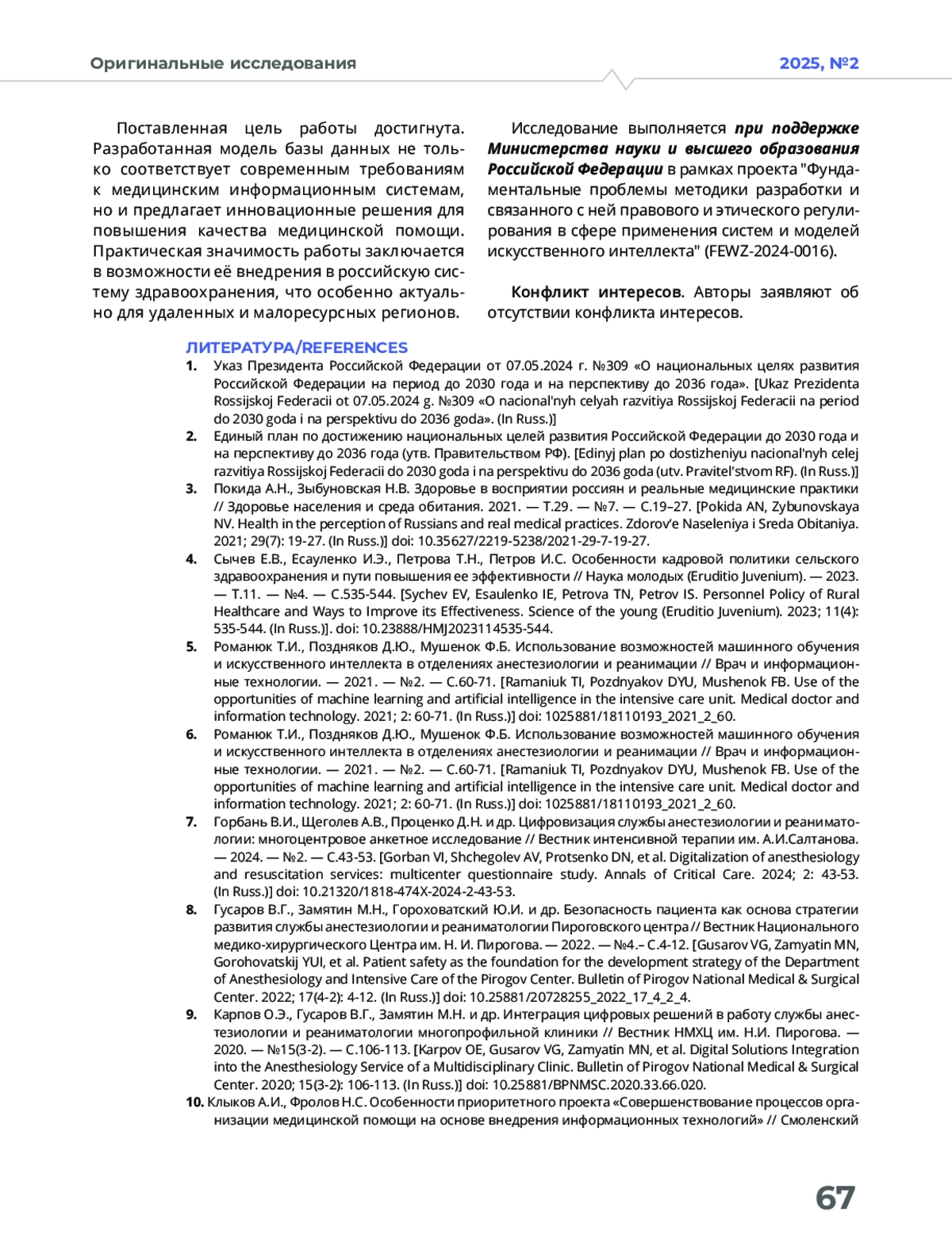 7. Горбань В.И., Щеголев А.В., Проценко Д.Н. и др. Цифровизация службы анестезиологии и реаниматологии: многоцентровое анкетное исследование // Вестник интенсивной терапии им. А.И. Салтанова. - 2024. - № 2. - C. 43-53. DOI: 10.21320/1818-474X-2024-2-43-53