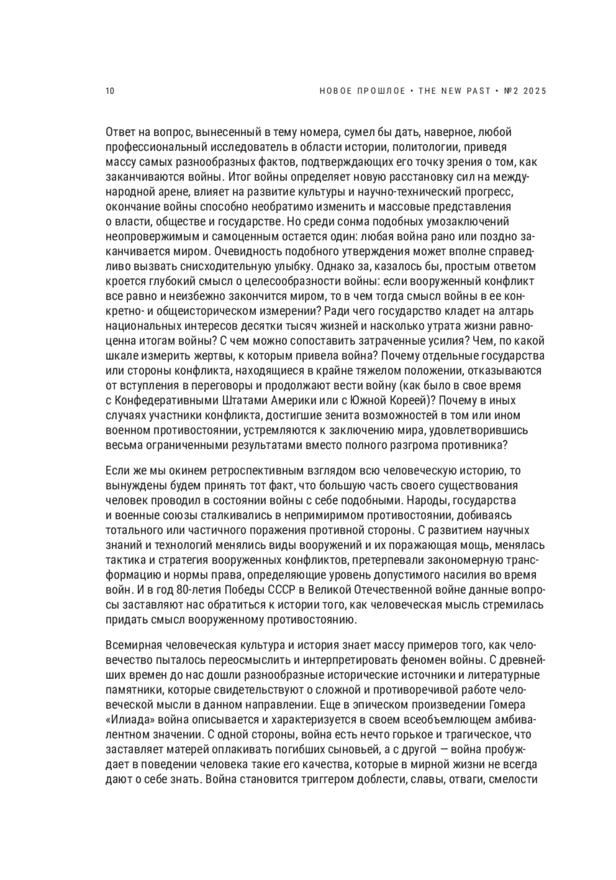 В своих ответах автор уточняет постановку вопросов относительно итогов войн прошлого, опираясь прежде всего на примеры завершения вооруженных конфликтов в Новой и новейшей истории. Указывается, что различные культуры победы и культуры поражения позволяют по-разному использовать ситуацию, сложившуюся после завершения вооруженных конфликтов. Иногда военные победы воспринимаются как политические поражения, побежденные же могут осуществлять своеобразный символический реванш, реализуя успешные мемориальные проекты, предлагая свои версии прошлого. Порой военные поражения создают условия для проведения болезненных внутренних реформ. Автор подвергает сомнению тезис о том, что пацифизм сам по себе позволит предотвратить войны. Указывается также, что всеобщая воинская повинность граждан (или их вооружение) исторически была тесно связана с демократическими и республиканскими политическими культурами, статус гражданина предполагал военную подготовку и участие в вооруженных конфликтах. Среди факторов, влияющих на память о Великой Отечественной войне в современной России, автор, опираясь на терминологию Я. Ассмана, указывает на постепенное и неизбежное снижение значения коммуникативной памяти, что предполагает усиление значения памяти культурной