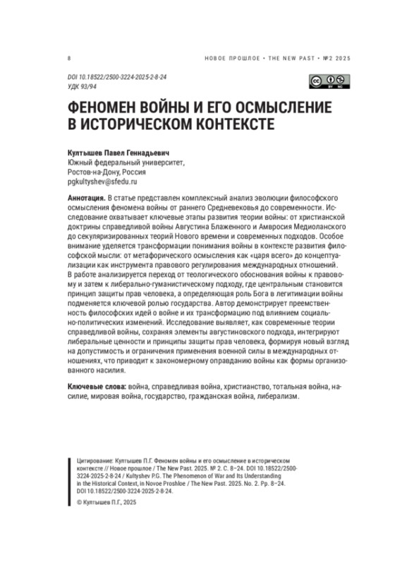 В статье представлен комплексный анализ эволюции философского осмысления феномена войны от раннего Средневековья до современности. Исследование охватывает ключевые этапы развития теории войны: от христианской доктрины справедливой войны Августина Блаженного и Амвросия Медиоланского до секуляризированных теорий Нового времени и современных подходов. Особое внимание уделяется трансформации понимания войны в контексте развития философской мысли: от метафорического осмысления как «царя всего» до концептуализации как инструмента правового регулирования международных отношений. В работе анализируется переход от теологического обоснования войны к правовому и затем к либерально-гуманистическому подходу, где центральным становится принцип защиты прав человека, а определяющая роль Бога в легитимации войны подменяется ключевой ролью государства. Автор демонстрирует преемственность философских идей о войне и их трансформацию под влиянием социально-политических изменений. Исследование выявляет, как современные теории справедливой войны, сохраняя элементы августиновского подхода, интегрируют либеральные ценности и принципы защиты прав человека, формируя новый взгляд на допустимость и ограничения применения военной силы в международных отношениях, что приводит к закономерному оправданию войны как формы организованного насилия