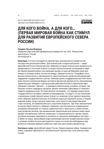 В статье исследуются перспективы экономического развития как последствия длительной войны. Для анализа взят конкретный регион — север европейской России (Архангельская губерния), который получил шанс вырваться из депрессивного состояния в связи со своим геополитическим положением в период Первой мировой войны (как имеющий выход в открытый Мировой океан для важных в условиях войны контактов между странами Антанты). Специфика этого региона заключается в невозможности самостоятельного развития без решающей поддержки государственного центра. Немалую долю в поддержании местной экономики играли и различные формы экспортно-импортной деятельности, связывающие Архангельскую губернию с центральными районами России и отдельными европейскими странами. Причина — в природно-климатических условиях, которые, при больших запасах природных ресурсов, делали население зависимым от внешнего подвоза продовольствия. История региона показывает, что периоды возрастания государственного интереса сменяются равнодушием, что ведет к оттоку населения и архаизации хозяйственной жизни. Близость к морским путям сделала Архангельскую губернию привлекательным источником сырья для мирового рынка, а Первая мировая война, когда в регионе заметным стало присутствие представителей стран-союзниц, эта привлекательность еще более возросла. При этом экономически активная общественность губернии стремилась воспользоваться создавшимися условиями (вниманием со стороны правительства) и приступить к самостоятельному развитию региона, при минимальном привлечении иностранных инвестиций. Однако послевоенные события, связанные с отрывом региона от центра страны, усугубили внешнюю зависимость населения от жизненно необходимых поставок в обмен на сырье. Дальнейшая индустриализация региона осуществлялась вновь в условиях особой его роли для развития страны и в качестве необходимых мер включала плановое ведение хозяйства и жесткую расстановку приоритетов