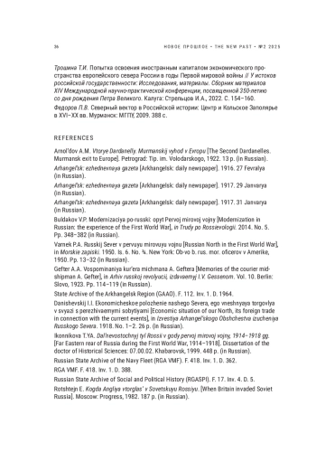 35. Troshina T.I. Popytka osvoeniya inostrannym kapitalom ekonomicheskogo prostranstva evropejskogo severa Rossii v gody Pervoj mirovoj vojny [Attempt of foreign capital to develop the economic space of the European north of Russia in the years of the First World War], in U istokov rossijskoj gosudarstvennosti: Issledovaniya, materialy. Sbornik materialov XIV Mezhdunarodnoy nauchno-prakticheskoy konferentsii, posvyashchennoy 350-letiyu so dnya rozhdeniya Petra Velikogo [At the origins of Russian statehood: Research, materials. Collection of materials of the XIV International Scientific and Practical Conference dedicated to the 350th anniversary of the birth of Peter the Great]. Kaluga: Streltsov I.A., 2022. Pp. 154-160 (in Russian).