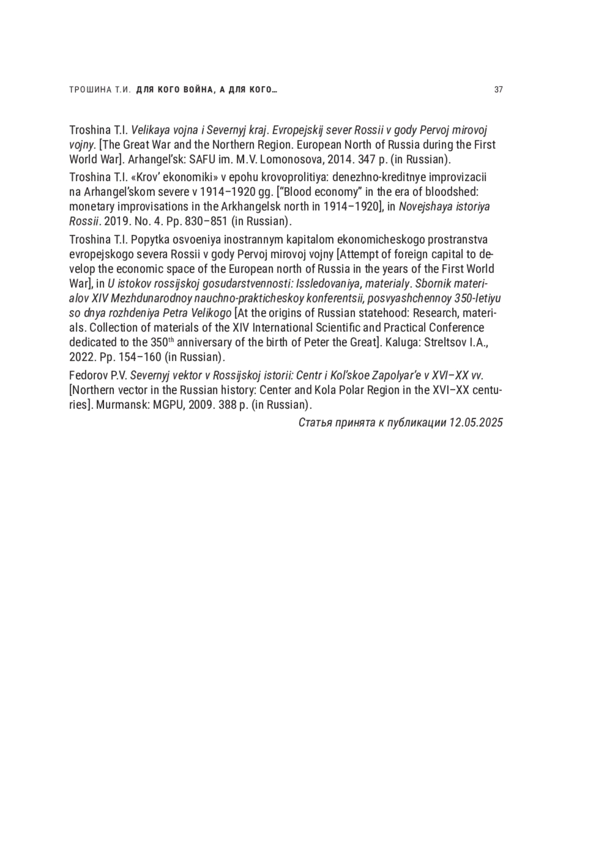 33. Troshina T.I. Velikaya vojna i Severnyj kraj. Evropejskij sever Rossii v gody Pervoj mirovoj vojny. [The Great War and the Northern Region. European North of Russia during the First World War]. Arhangel’sk: SAFU im. M.V. Lomonosova, 2014. 347 p. (in Russian).