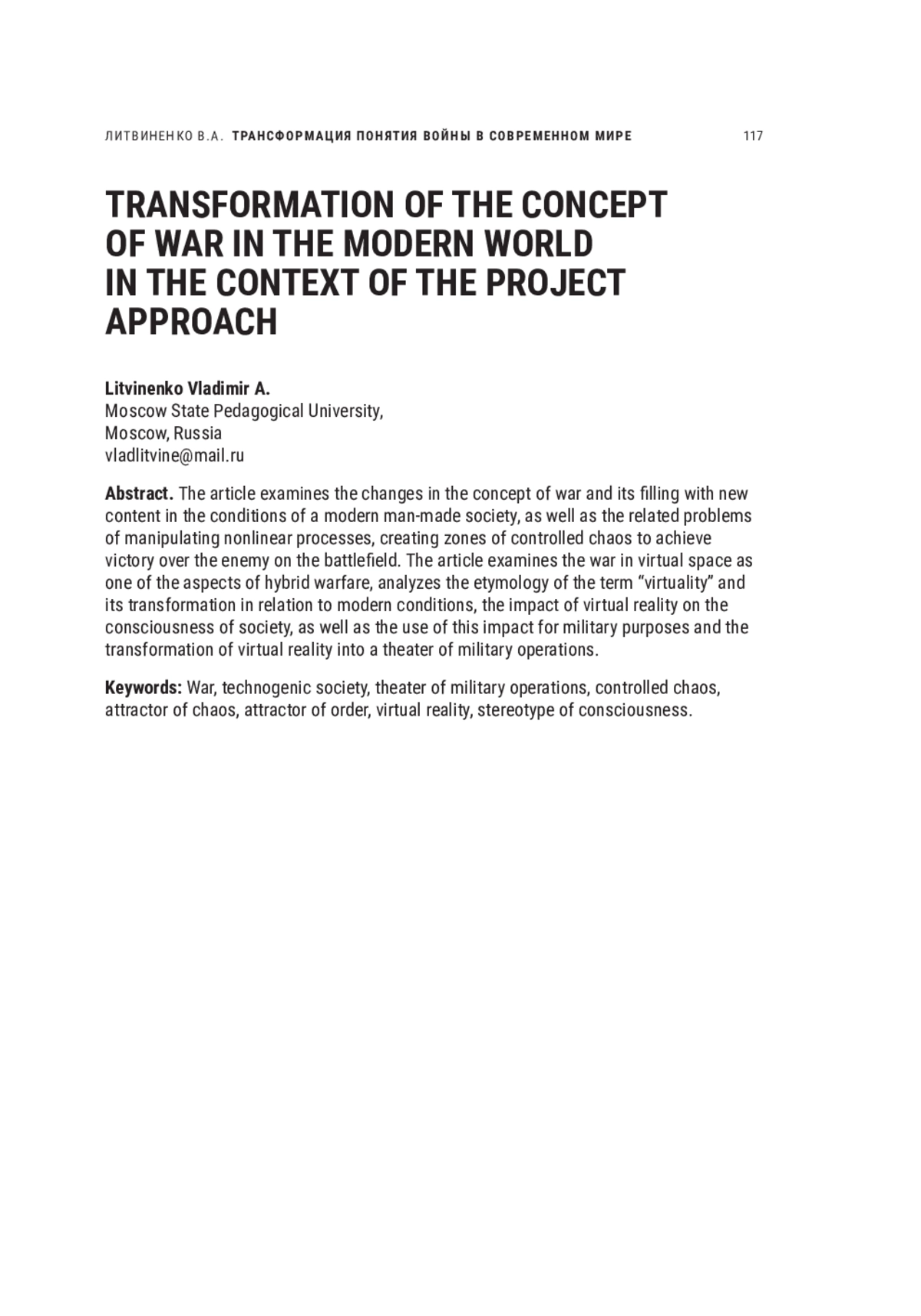 Статья: ТРАНСФОРМАЦИЯ ПОНЯТИЯ ВОЙНЫ В СОВРЕМЕННОМ МИРЕ В КОНТЕКСТЕ ПРОЕКТНОГО ПОДХОДА (2025)