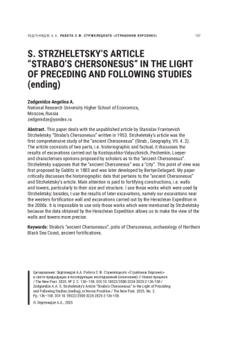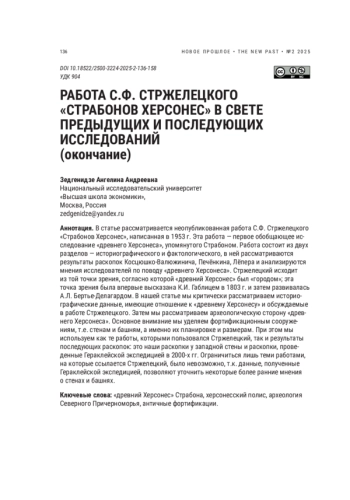 В статье рассматривается неопубликованная работа С. Ф. Стржелецкого «Страбонов Херсонес», написанная в 1953 г. Эта работа — первое обобщающее исследование «древнего Херсонеса», упомянутого Страбоном. Работа состоит из двух разделов — историографического и фактологического, в ней рассматриваются результаты раскопок Косцюшко-Валюжинича, Печёнкина, Лёпера и анализируются мнения исследователей по поводу «древнего Херсонеса». Стржелецкий исходит из той точки зрения, согласно которой «древний Херсонес» был «городом»; эта точка зрения была впервые высказана К. И. Габлицем в 1803 г. и затем развивалась А. Л. Бертье-Делагардом. В нашей статье мы критически рассматриваем историографические данные, имеющие отношение к «древнему Херсонесу» и обсуждаемые в работе Стржелецкого. Затем мы рассматриваем археологическую сторону «древнего Херсонеса». Основное внимание мы уделяем фортификационным сооружениям, т. е. стенам и башням, а именно их планировке и размерам. При этом мы используем как те работы, которыми пользовался Стржелецкий, так и результаты последующих раскопок: это наши раскопки у западной стены и раскопки, проведенные Гераклейской экспедицией в 2000-х гг. Ограничиться лишь теми работами, на которые ссылается Стржелецкий, было невозможно, т. к. данные, полученные Гераклейской экспедицией, позволяют уточнить некоторые более ранние мнения о стенах и башнях