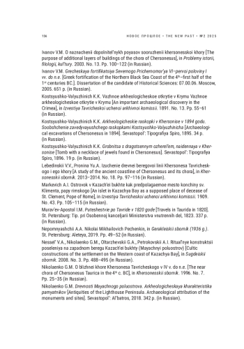 77. Ivanov V.M. O naznachenii dopolnitel’nykh poyasov sooruzhenii khersonesskoi khory [The purpose of additional layers of buildings of the chora of Chersonesus], in Problemy istorii, filologii, kul’tury. 2003. No. 13. Pp. 100-122 (in Russian).